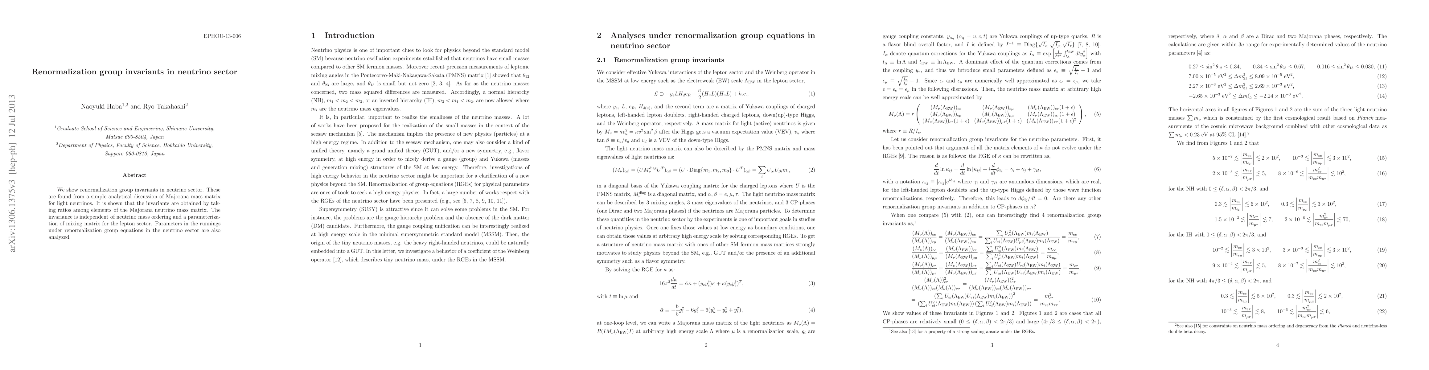 This paper identifies renormalization group invariants in the neutrino sector derived from the Majorana mass matrix, demonstrating that these invariants are ratios of matrix elements and remain invariant regardless of neutrino mass ordering or mixing matrix parameterization. Additionally, it analyzes parameters involved in the renormalization group equations for neutrinos.
