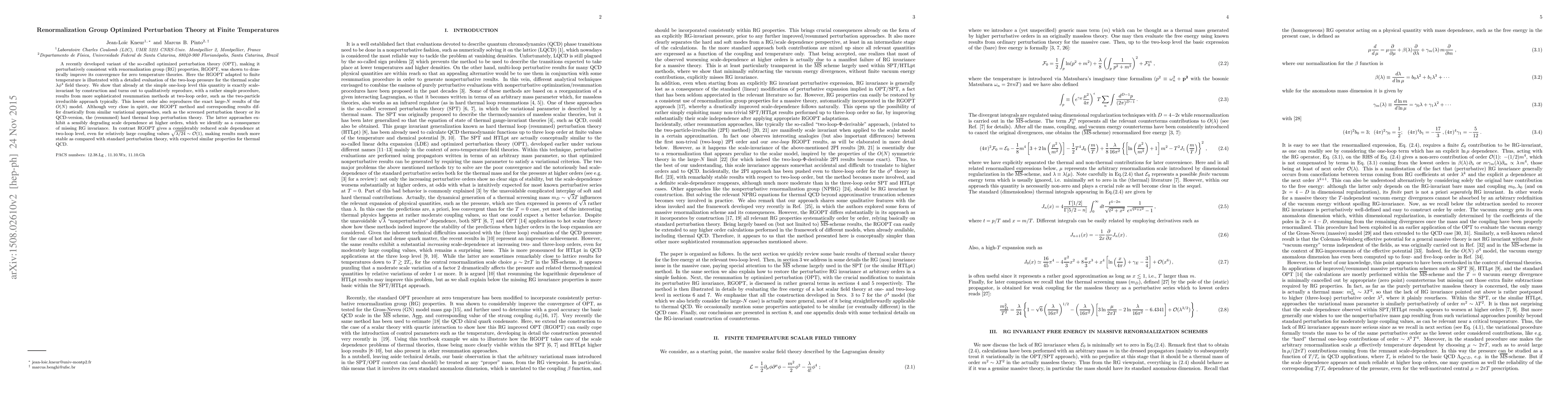 The paper presents a finite-temperature variant of optimized perturbation theory (RGOPT), which maintains renormalization group invariance and shows improved convergence over standard perturbation theory, particularly in the thermal scalar $\lambda\phi^4$ field theory. At two-loop order, RGOPT achieves scale invariance and provides results comparable to sophisticated resummation methods.