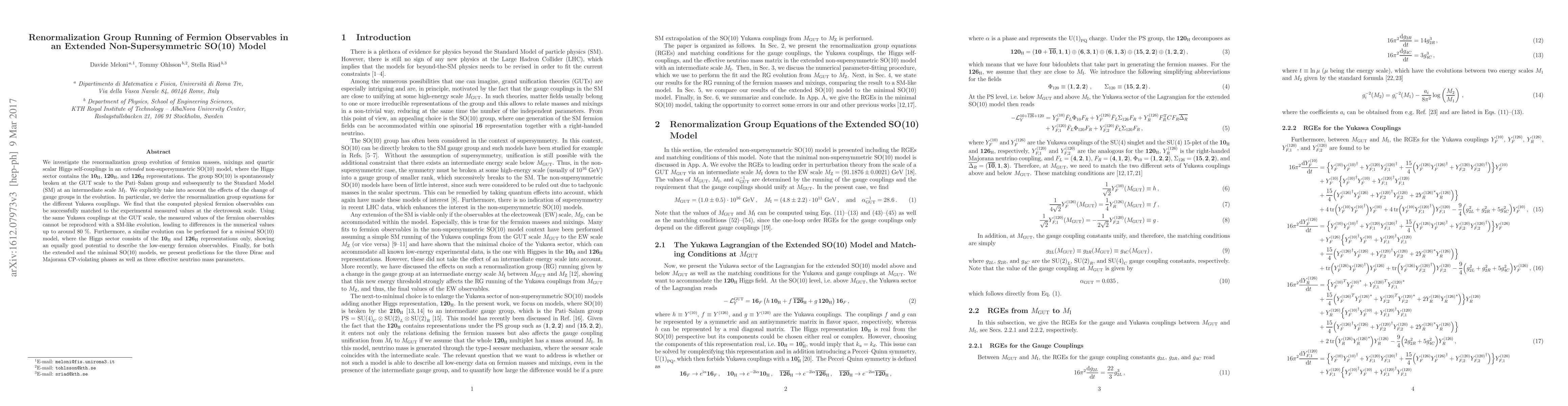 We investigate the renormalization group evolution of fermion masses, mixings and quartic scalar Higgs self-couplings in an ${\it extended}$ non-supersymmetric SO(10) model, where the Higgs sector contains the ${\bf 10}_{\rm H}$, ${\bf 120}_{\rm H}$, and ${\bf 126}_{\rm H}$ representations. The group SO(10) is spontaneously broken at the GUT scale to the Pati-Salam group and subsequently to the Standard Model (SM) at an intermediate scale $M_{\rm I}$. We explicitly take into account the effects of the change of gauge groups in the evolution. In particular, we derive the renormalization group equations for the different Yukawa couplings. We find that the computed physical fermion observables can be successfully matched to the experimental measured values at the electroweak scale. Using the same Yukawa couplings at the GUT scale, the measured values of the fermion observables cannot be reproduced with a SM-like evolution, leading to differences in the numerical values up to around 80 %. Furthermore, a similar evolution can be performed for a ${\it minimal}$ SO(10) model, where the Higgs sector consists of the ${\bf 10}_{\rm H}$ and ${\bf 126}_{\rm H}$ representations only, showing an equally good potential to describe the low-energy fermion observables. Finally, for both the extended and the minimal SO(10) models, we present predictions for the three Dirac and Majorana CP-violating phases as well as three effective neutrino mass parameters.