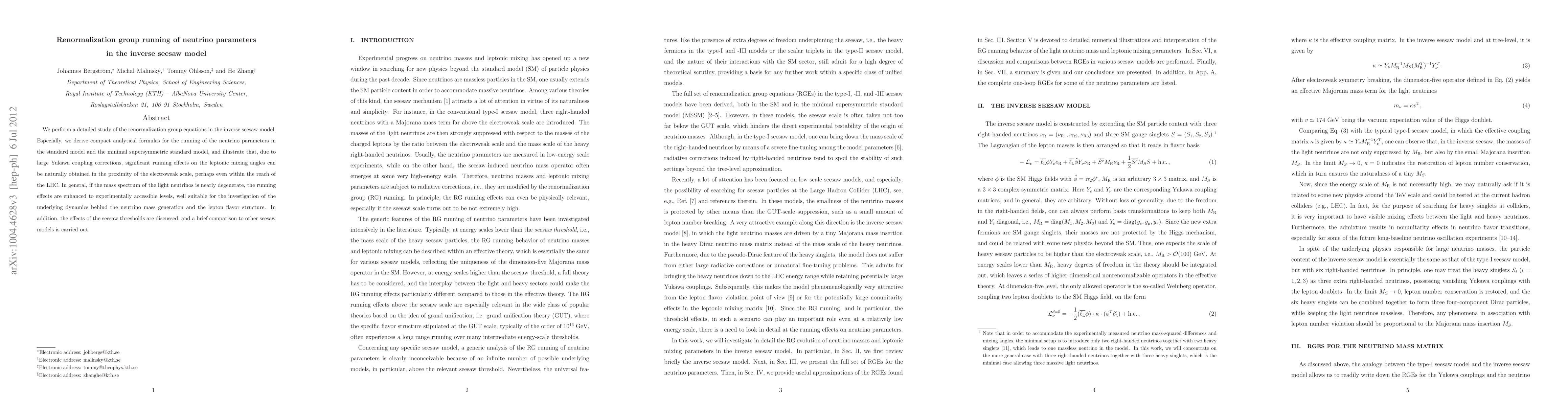 This paper studies the renormalization group running of neutrino parameters in the inverse seesaw model, deriving analytical formulas that show significant running effects on leptonic mixing angles due to large Yukawa corrections, potentially observable at the LHC. The effects are enhanced for nearly degenerate light neutrino masses, aiding in the investigation of neutrino mass generation and flavor structure.
