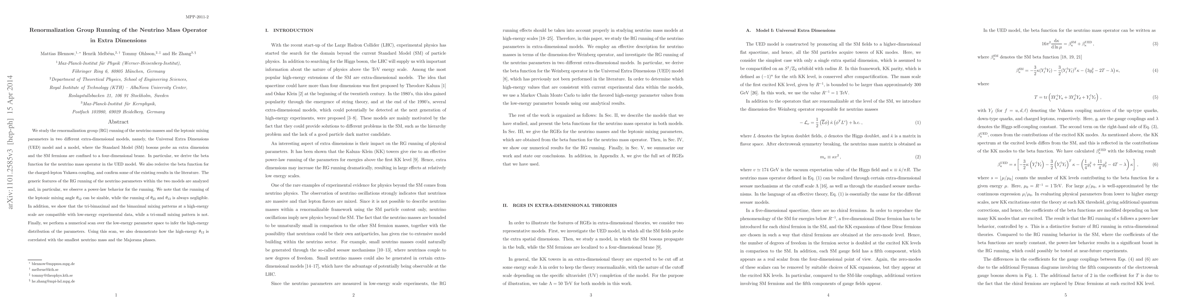 This paper investigates the renormalization group running of neutrino masses and mixing parameters in two extra-dimensional models: Universal Extra Dimensions (UED) and a model with SM fermions on a brane. It derives beta functions for the neutrino mass operator and confirms existing results, noting significant running for the mixing angle θ_{12} and negligible running for θ_{23} and θ_{13}. The study finds compatibility between tri-bimaximal and bimaximal mixing patterns with experimental data.
