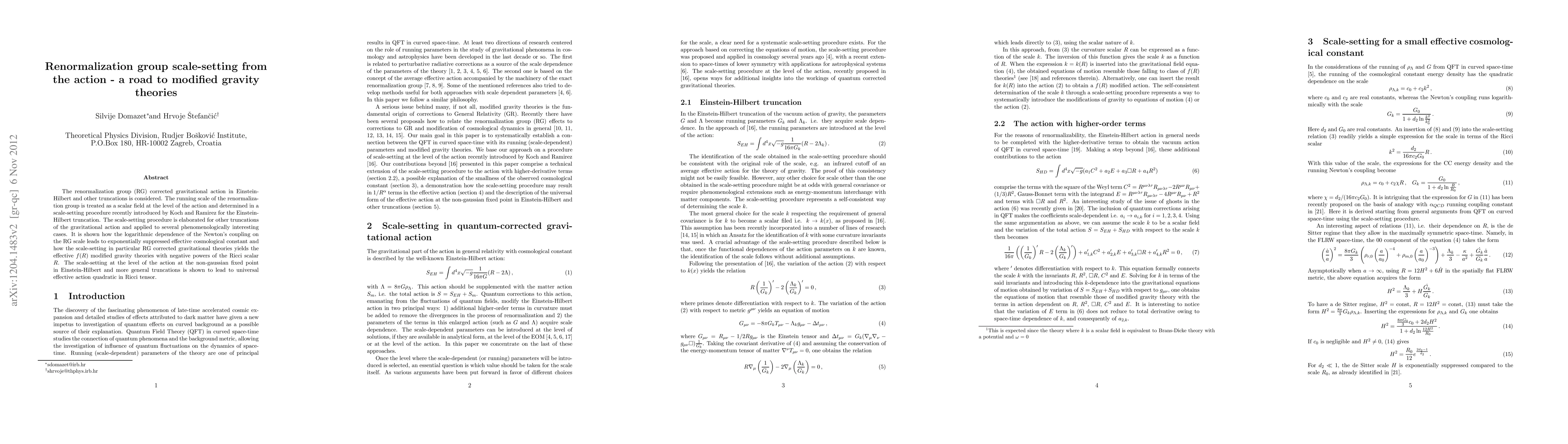 The renormalization group (RG) corrected gravitational action in Einstein-Hilbert and other truncations is considered. The running scale of the renormalization group is treated as a scalar field at the level of the action and determined in a scale-setting procedure recently introduced by Koch and Ramirez for the Einstein-Hilbert truncation. The scale-setting procedure is elaborated for other truncations of the gravitational action and applied to several phenomenologically interesting cases. It is shown how the logarithmic dependence of the Newton's coupling on the RG scale leads to exponentially suppressed effective cosmological constant and how the scale-setting in particular RG corrected gravitational theories yields the effective $f(R)$ modified gravity theories with negative powers of the Ricci scalar $R$. The scale-setting at the level of the action at the non-gaussian fixed point in Einstein-Hilbert and more general truncations is shown to lead to universal effective action quadratic in Ricci tensor.