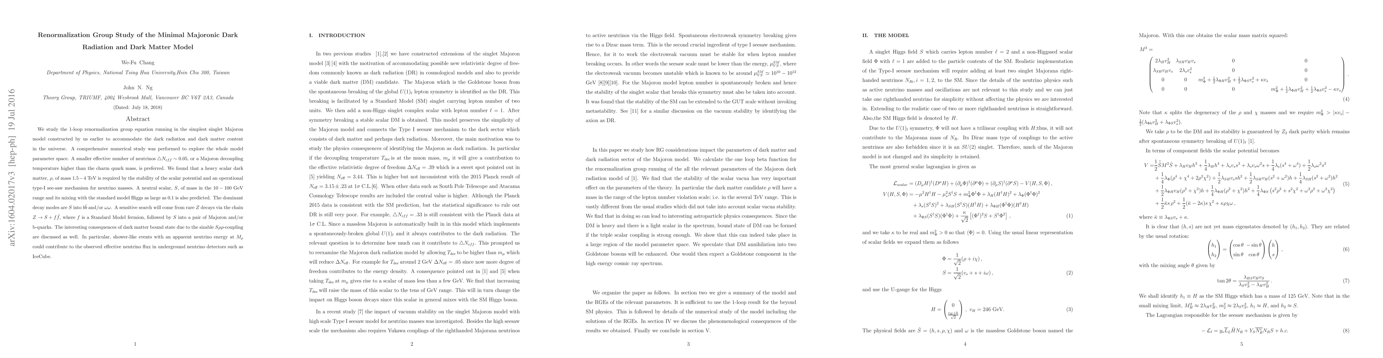 We study the 1-loop renormalization group equation running in the simplest singlet Majoron model constructed by us earlier to accommodate the dark radiation and dark matter content in the universe. A comprehensive numerical study was performed to explore the whole model parameter space. A smaller effective number of neutrinos $\triangle N_{eff}\sim 0.05$, or a Majoron decoupling temperature higher than the charm quark mass, is preferred. We found that a heavy scalar dark matter, $\rho$, of mass $1.5-4$ TeV is required by the stability of the scalar potential and an operational type-I see-saw mechanism for neutrino masses. A neutral scalar, $S$, of mass in the $10-100$ GeV range and its mixing with the standard model Higgs as large as $0.1$ is also predicted. The dominant decay modes are $S$ into $b\bar{b}$ and/or $\omega\omega$. A sensitive search will come from rare $Z$ decays via the chain $Z\rightarrow S+ f\bar{f}$, where $f$ is a Standard Model fermion, followed by $S$ into a pair of Majoron and/or b-quarks. The interesting consequences of dark matter bound state due to the sizable $S\rho \rho$-coupling are discussed as well. In particular, shower-like events with an apparent neutrino energy at $M_\rho$ could contribute to the observed effective neutrino flux in underground neutrino detectors such as IceCube.