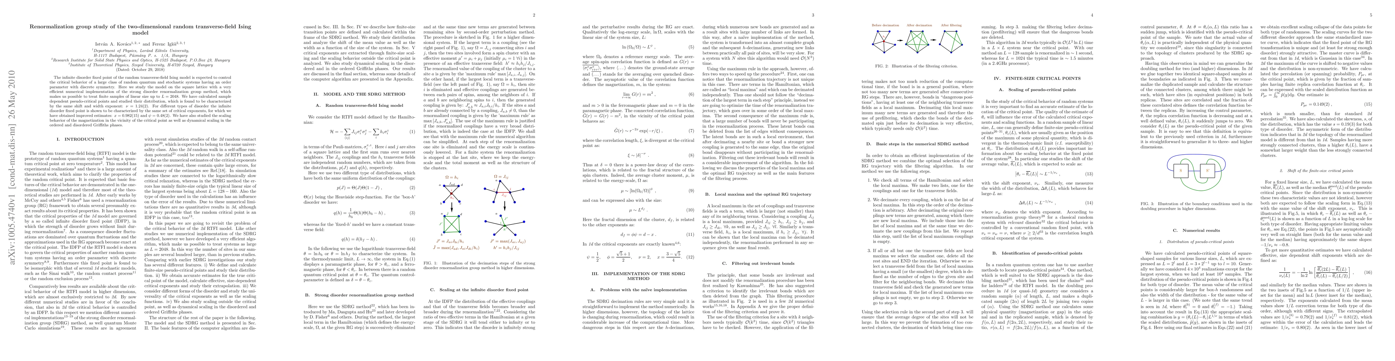 The infinite disorder fixed point of the random transverse-field Ising model is expected to control the critical behavior of a large class of random quantum and stochastic systems having an order parameter with discrete symmetry. Here we study the model on the square lattice with a very efficient numerical implementation of the strong disorder renormalization group method, which makes us possible to treat finite samples of linear size up to $L=2048$. We have calculated sample dependent pseudo-critical points and studied their distribution, which is found to be characterized by the same shift and width exponent: $\nu=1.24(2)$. For different types of disorder the infinite disorder fixed point is shown to be characterized by the same set of critical exponents, for which we have obtained improved estimates: $x=0.982(15)$ and $\psi=0.48(2)$. We have also studied the scaling behavior of the magnetization in the vicinity of the critical point as well as dynamical scaling in the ordered and disordered Griffiths phases.