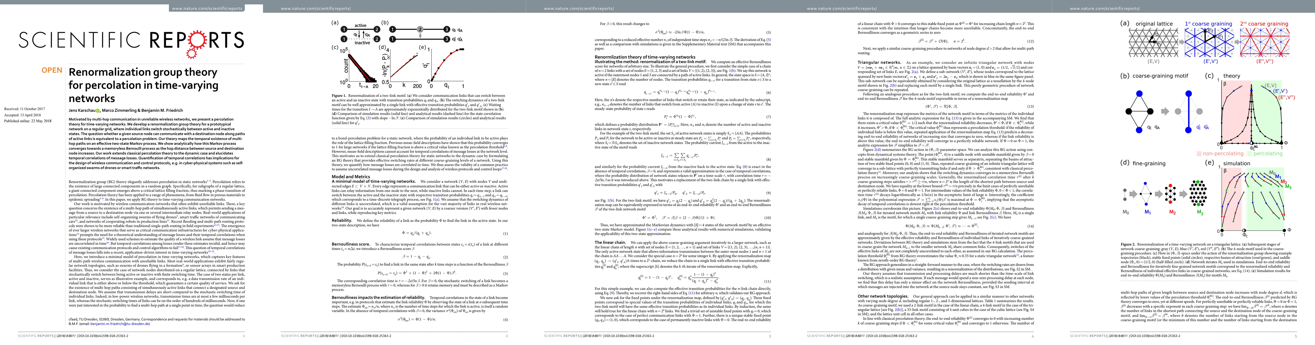This paper develops a renormalization group theory for percolation in time-varying networks, focusing on multi-hop communication in unreliable wireless networks. It shows how the temporal existence of multi-hop paths converges to a memory-less Bernoulli process, extending classical percolation theory to dynamic scenarios and providing insights for designing wireless communication protocols.