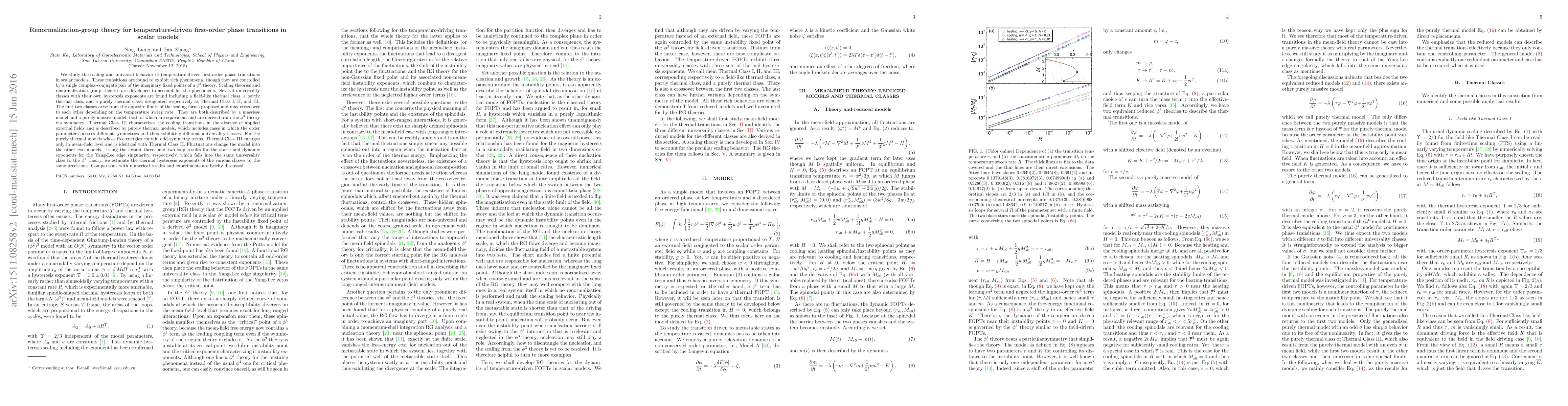 This paper develops renormalization-group theories to study temperature-driven first-order phase transitions in scalar models, identifying several universality classes with distinct thermal hysteresis exponents. The study reveals three main classes, with transitions influenced by the temperature sweep rate and the presence of external fields.