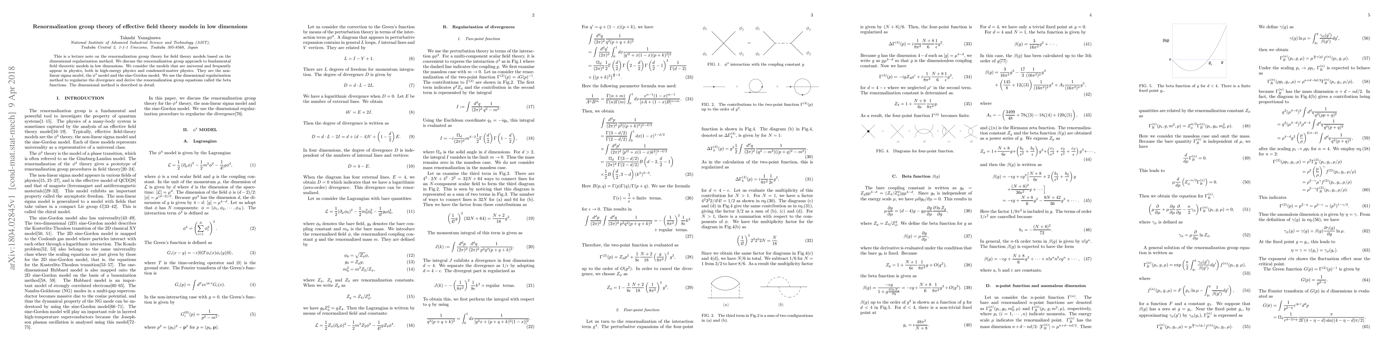 This lecture note explains renormalization group theory for field theory models in low dimensions using dimensional regularization. It focuses on universal models like non-linear sigma, $phi^4$, and sine-Gordon models, deriving their renormalization group equations or beta functions.