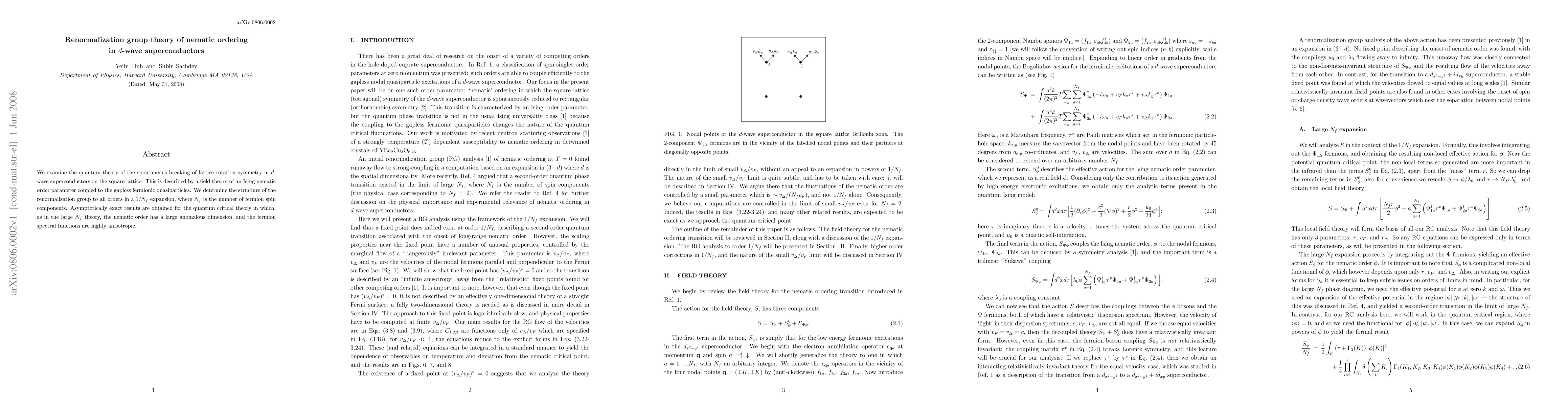 This paper investigates the quantum theory of nematic ordering in d-wave superconductors using renormalization group analysis, focusing on the spontaneous breaking of lattice rotation symmetry. It reveals the structure of the theory with an Ising nematic order parameter and finds that the nematic order exhibits a large anomalous dimension near the quantum critical point.