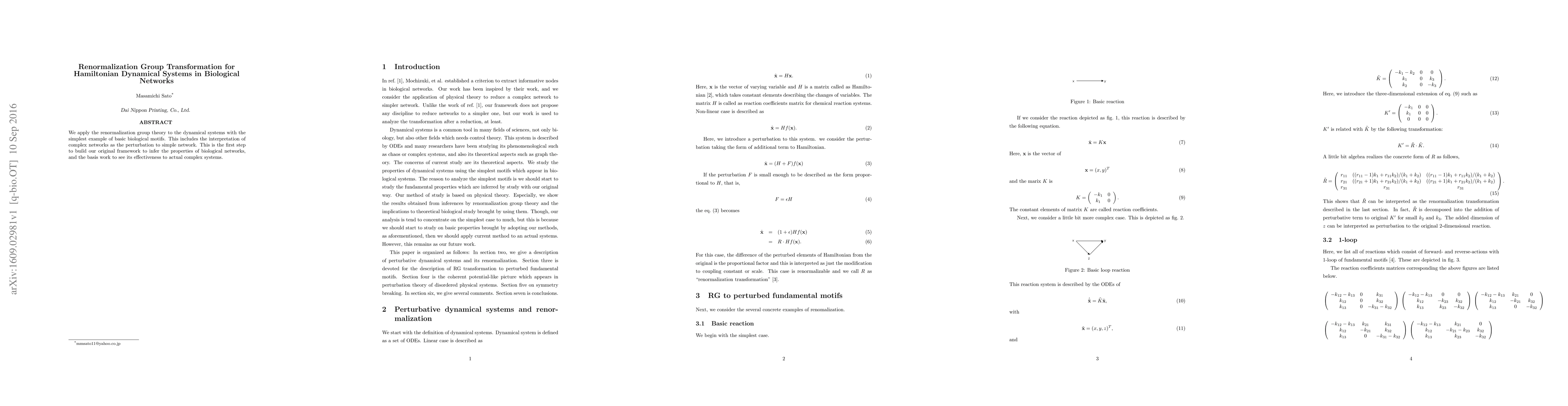 We apply the renormalization group theory to the dynamical systems with the simplest example of basic biological motifs. This includes the interpretation of complex networks as the perturbation to simple network. This is the first step to build our original framework to infer the properties of biological networks, and the basis work to see its effectiveness to actual complex systems.