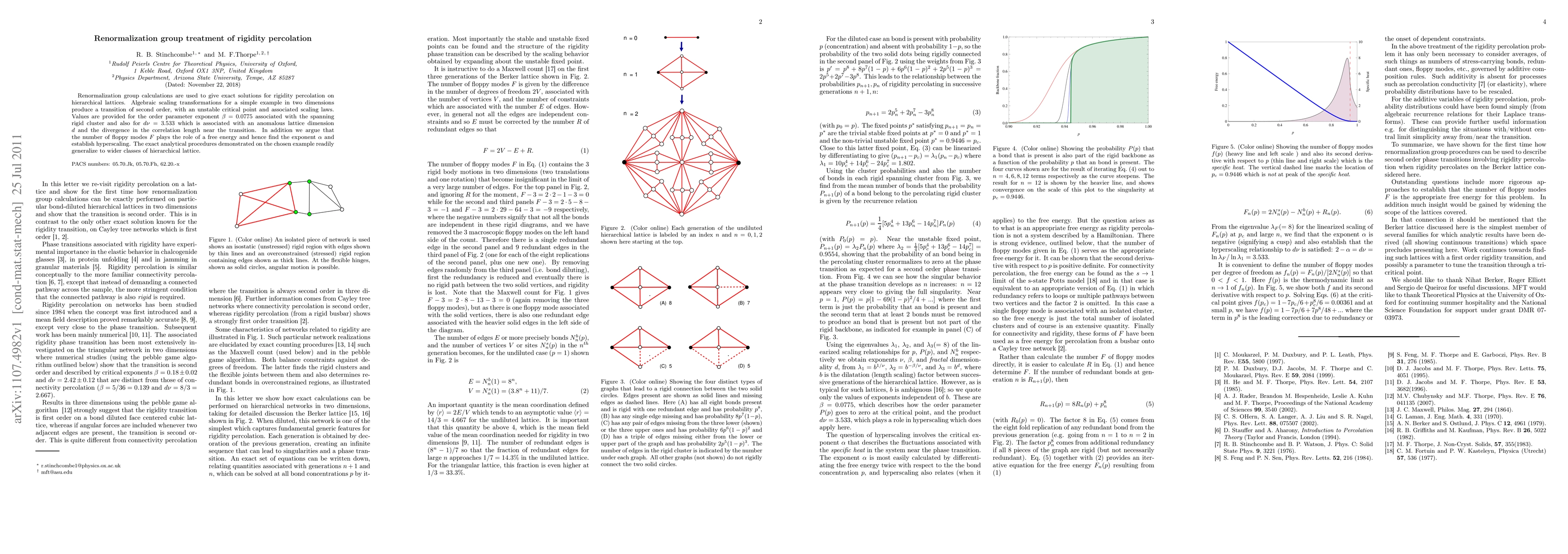 This paper uses renormalization group methods to derive exact solutions for rigidity percolation on hierarchical lattices, identifying a second-order transition with scaling laws and providing values for critical exponents, including $\beta = 0.0775$ and $d \nu = 3.533$. The study also establishes the role of floppy modes as a free energy and confirms hyperscaling relations.