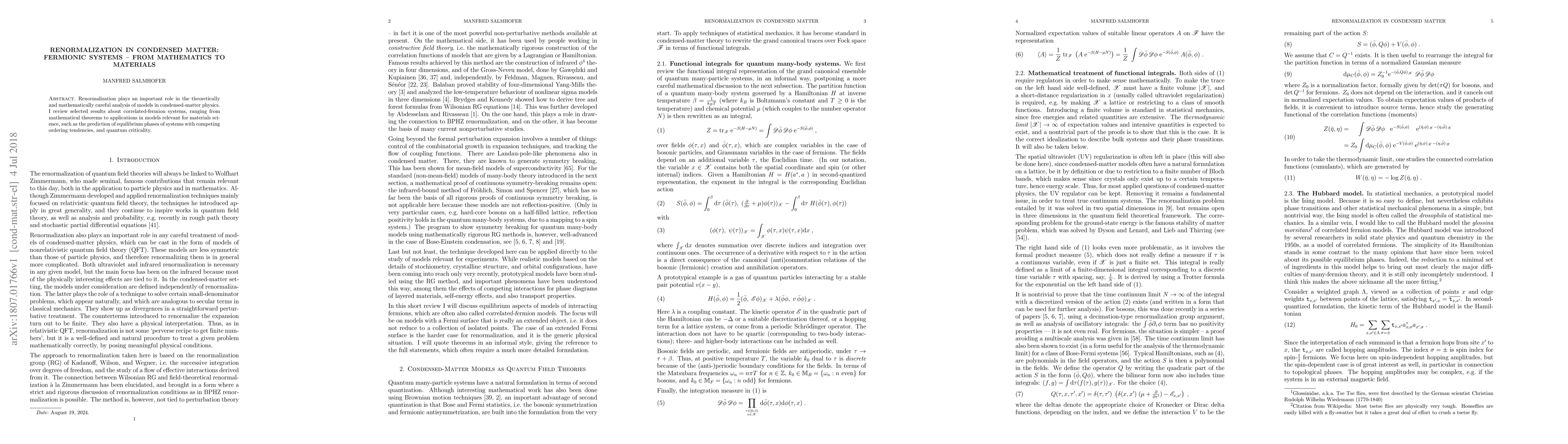 Summary: This paper reviews the role of renormalization in condensed matter physics, focusing on correlated-fermion systems, and bridges mathematical theorems with practical applications in materials science, including predicting equilibrium phases and quantum criticality.