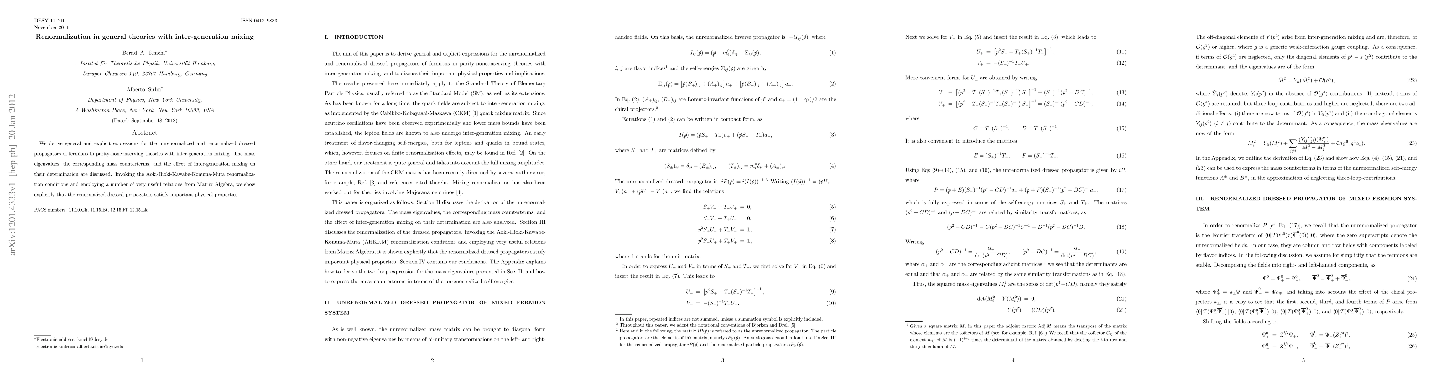 This paper derives expressions for the dressed propagators of fermions in parity-nonconserving theories with inter-generation mixing, focusing on the renormalization process and the impact of such mixing on mass eigenvalues. The study uses the Aoki-Hioki-Kawabe-Konuma-Muta renormalization conditions and matrix algebra to demonstrate the physical properties of the renormalized propagators.