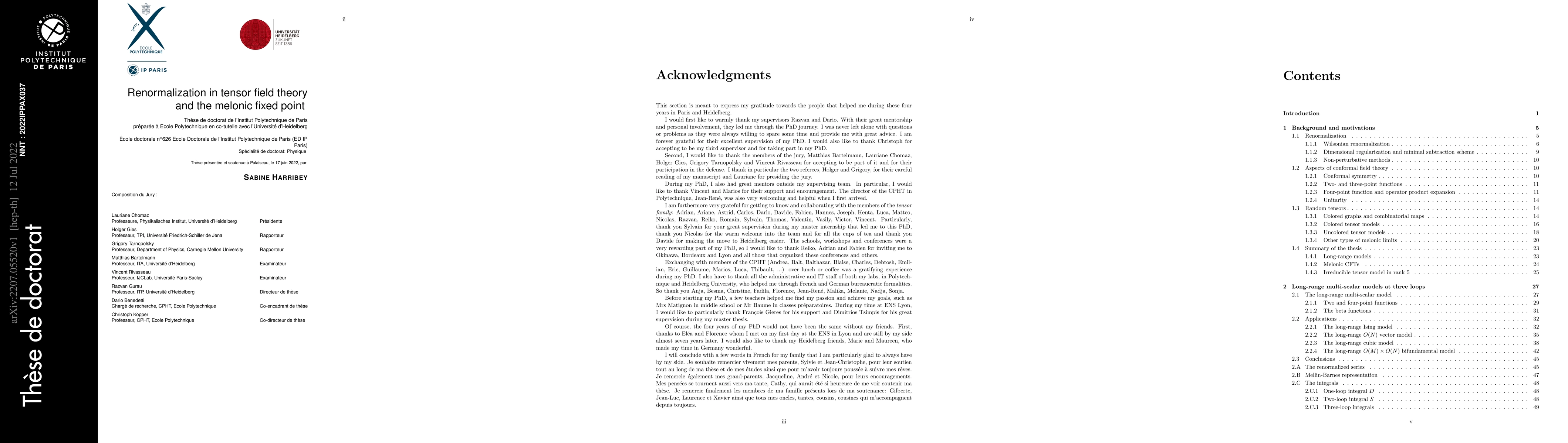 This thesis focuses on renormalization of tensor field theories. Its first part considers a quartic tensor model with $O(N)^3$ symmetry and long-range propagator. The existence of a non-perturbative fixed point in any $d$ at large $N$ is established. We found four lines of fixed points parametrized by the so-called tetrahedral coupling. One of them is infrared attractive, strongly interacting and gives rise to a new kind of CFT, called melonic CFTs which are then studied in more details. We first compute dimensions of bilinears and OPE coefficients at the fixed point which are consistent with a unitary CFT at large $N$. We then compute $1/N$ corrections. At next-to-leading order, the line of fixed points collapses to one fixed point. However, the corrections are complex and unitarity is broken at NLO. Finally, we show that this model respects the $F$-theorem. The next part of the thesis investigates sextic tensor field theories in rank $3$ and $5$. In rank $3$, we found two IR stable real fixed points in short range and a line of IR stable real fixed points in long range. Surprisingly, the only fixed point in rank $5$ is the Gaussian one. For the rank $3$ model, in the short-range case, we still find two IR stable fixed points at NLO. However, in the long-range case, the corrections to the fixed points are non-perturbative and hence unreliable: we found no precursor of the large $N$ fixed point. The last part of the thesis investigates the class of model exhibiting a melonic large $N$ limit. We prove that models with tensors in an irreducible representation of $O(N)$ or $Sp(N)$ in rank $5$ indeed admit a large $N$ limit. This generalization relies on recursive bounds derived from a detailed combinatorial analysis of Feynman graphs involved in the perturbative expansion of our model.
