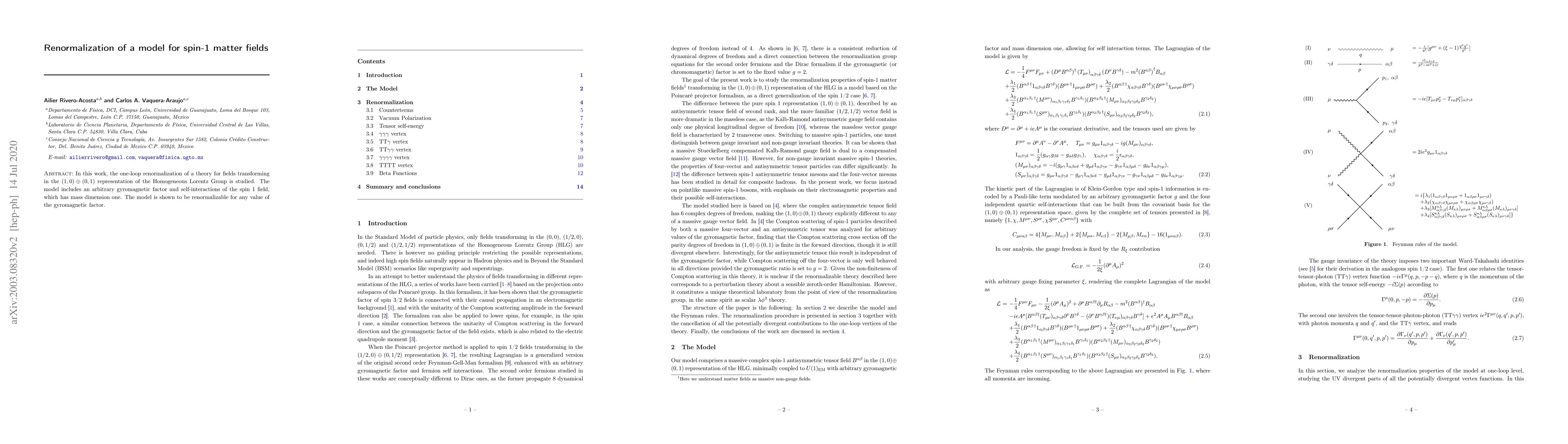 In this work, the one-loop renormalization of a theory for fields transforming in the $(1,0)\oplus(0,1)$ representation of the Homogeneous Lorentz Group is studied. The model includes an arbitrary gyromagnetic factor and self-interactions of the spin 1 field, which has mass dimension one. The model is shown to be renormalizable for any value of the gyromagnetic factor.