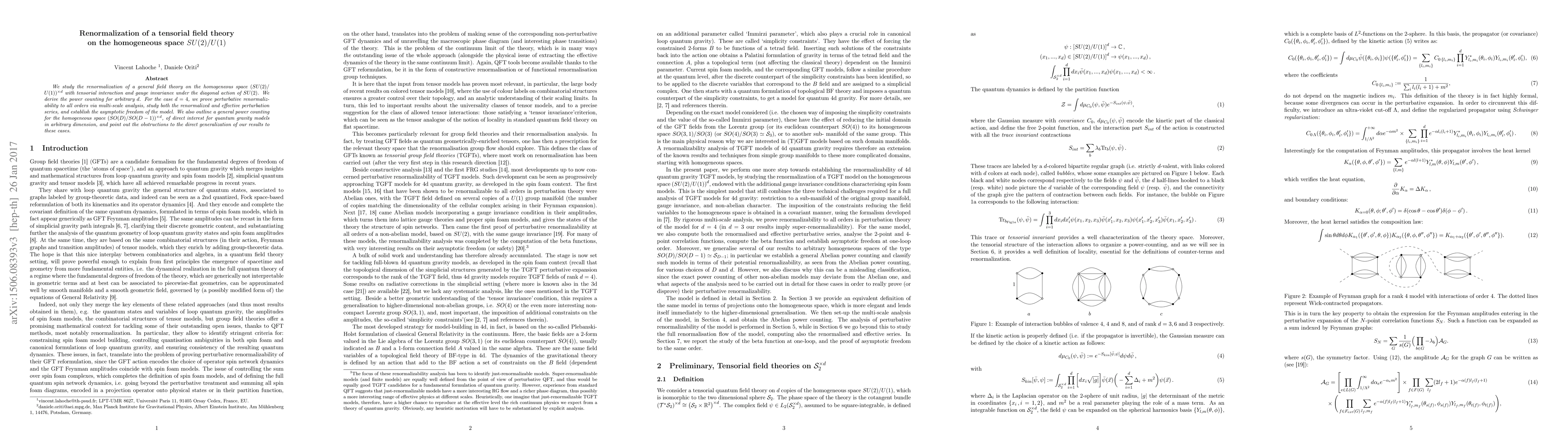 This paper investigates the renormalization of a tensorial field theory on the SU(2)/U(1) homogeneous space, deriving power counting for arbitrary dimensions and proving perturbative renormalizability in four dimensions via multi-scale analysis, while also discussing the implications for quantum gravity models in general dimensions.