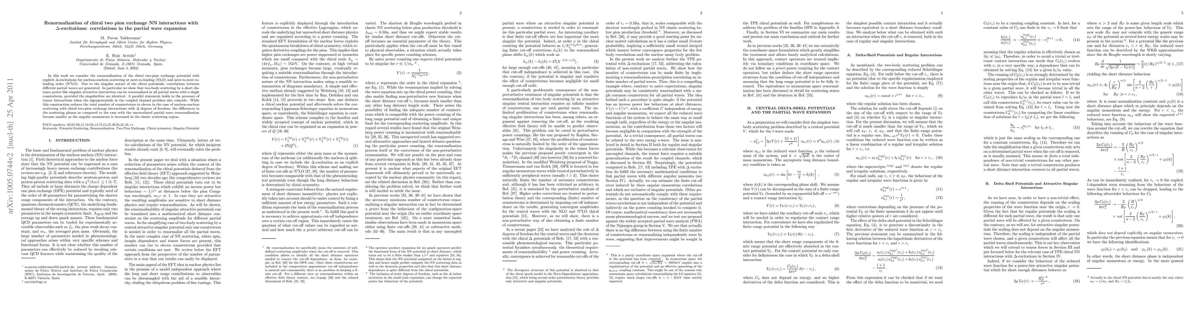 This paper explores the renormalization of chiral two-pion exchange nucleon-nucleon interactions with delta excitations, demonstrating that identical singularities allow for a single counterterm to renormalize all partial waves. The study finds that while the total number of counterterms is reduced to eleven, scattering phase differences diminish with higher angular momentum.