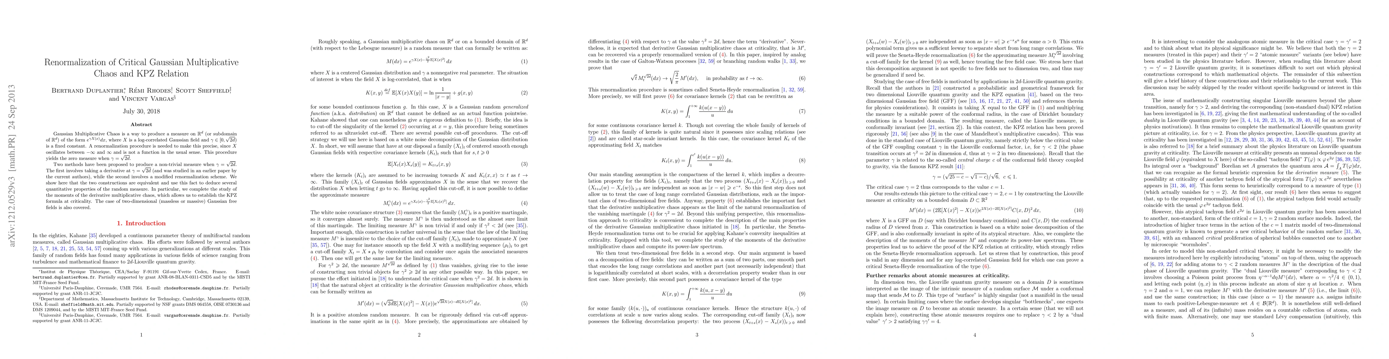 This paper explores the renormalization of critical Gaussian Multiplicative Chaos, demonstrating the equivalence of two methods to produce a non-trivial measure at the critical value $\gamma=\sqrt{2d}$. The study establishes the KPZ formula at criticality and covers properties of two-dimensional Gaussian free fields.