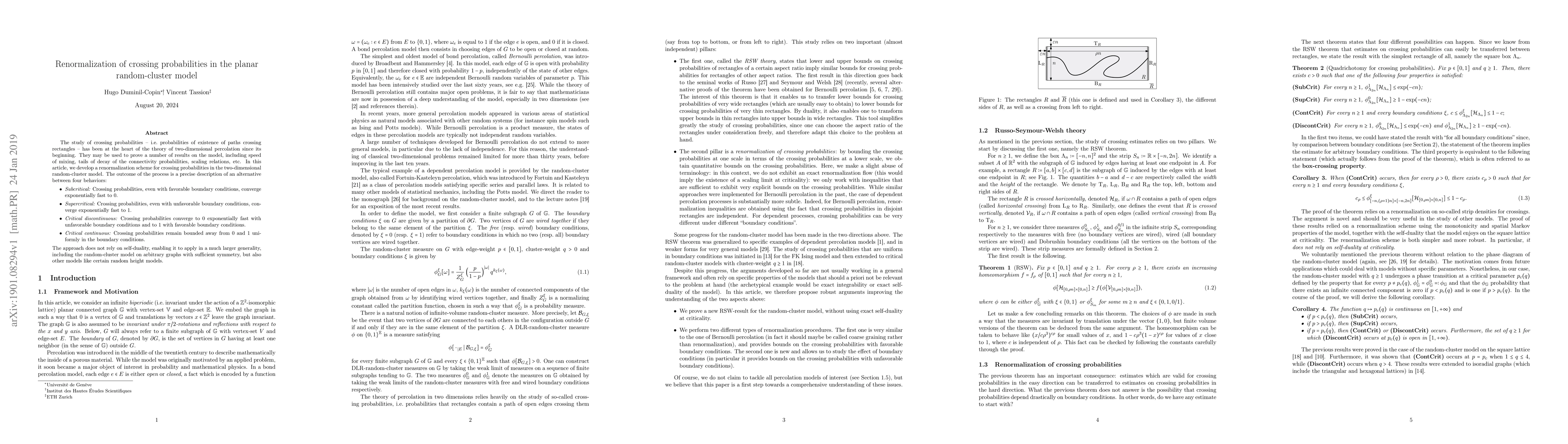 The study of crossing probabilities - i.e. probabilities of existence of paths crossing rectangles - has been at the heart of the theory of two-dimensional percolation since its beginning. They may be used to prove a number of results on the model, including speed of mixing, tails of decay of the connectivity probabilities, scaling relations, etc. In this article, we develop a renormalization scheme for crossing probabilities in the two-dimensional random-cluster model. The outcome of the process is a precise description of an alternative between four behaviors: - Subcritical: Crossing probabilities, even with favorable boundary conditions, converge exponentially fast to 0. - Supercritical: Crossing probabilities, even with unfavorable boundary conditions, converge exponentially fast to 1. - Critical discontinuous: Crossing probabilities converge to 0 exponentially fast with unfavorable boundary conditions and to 1 with favorable boundary conditions. - Critical continuous: Crossing probabilities remain bounded away from 0 and 1 uniformly in the boundary conditions. The approach does not rely on self-duality, enabling it to apply in a much larger generality, including the random-cluster model on arbitrary graphs with sufficient symmetry, but also other models like certain random height models.