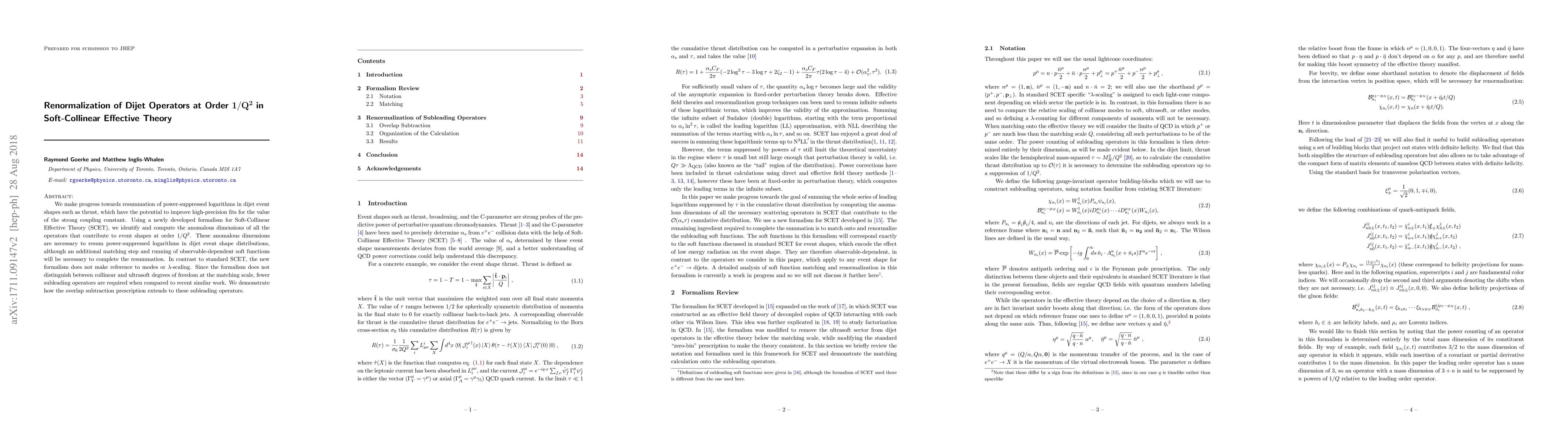 This paper develops a new Soft-Collinear Effective Theory (SCET) formalism to compute the anomalous dimensions of dijet operators at order $1/Q^2$, aiding in the resummation of power-suppressed logarithms in event shapes and improving precision fits for the strong coupling constant. The new approach avoids $\lambda$-scaling and requires fewer subleading operators compared to previous methods.