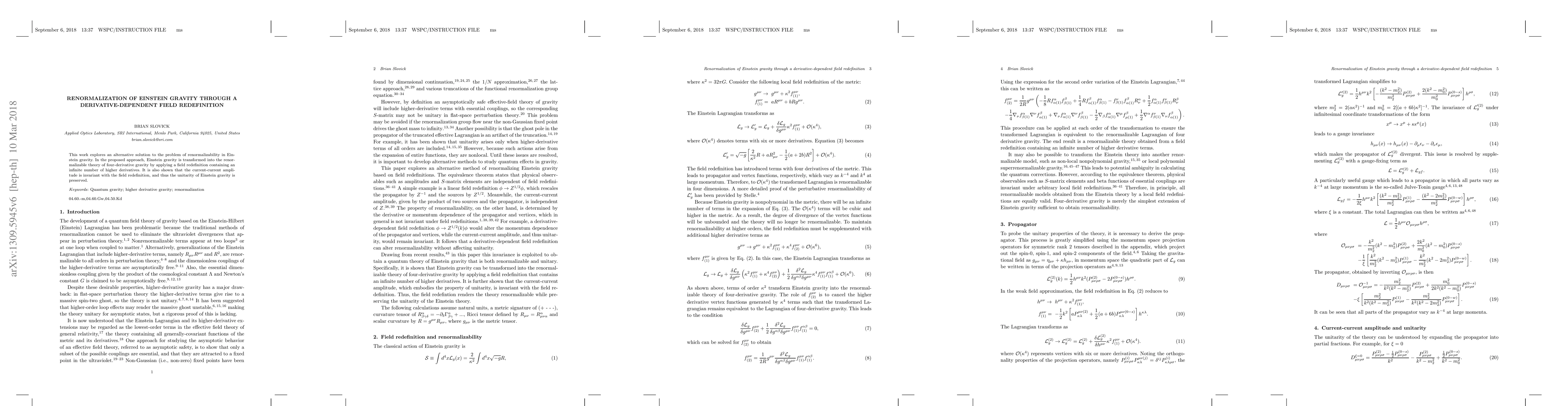 This paper proposes a field redefinition to transform Einstein gravity into a renormalizable four-derivative theory, preserving the unitarity of the original theory through an invariant current-current amplitude.