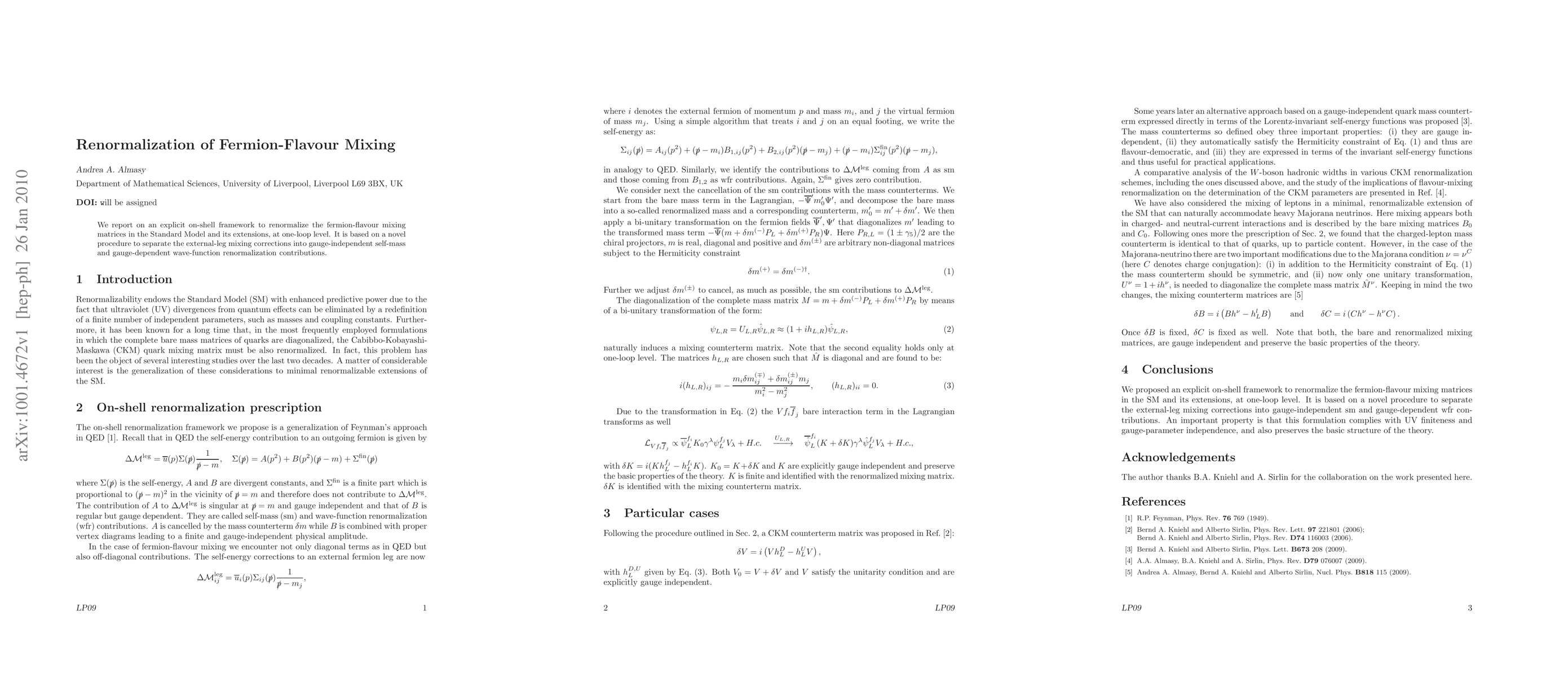 We report on an explicit on-shell framework to renormalize the fermion-flavour mixing matrices in the Standard Model and its extensions, at one-loop level. It is based on a novel procedure to separate the external-leg mixing corrections into gauge-independent self-mass and gauge-dependent wave-function renormalization contributions.