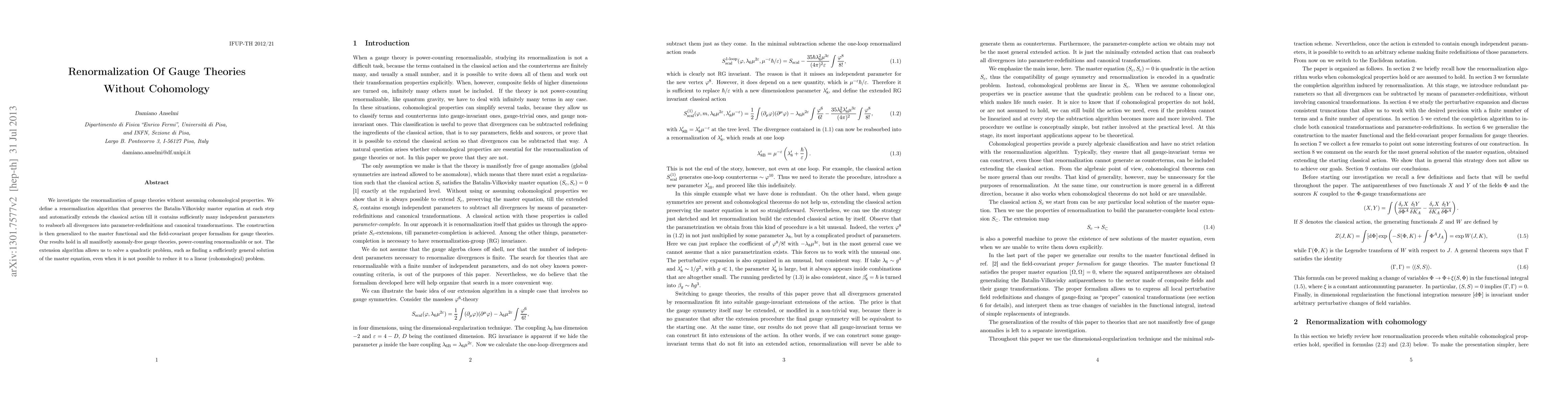 We investigate the renormalization of gauge theories without assuming cohomological properties. We define a renormalization algorithm that preserves the Batalin-Vilkovisky master equation at each step and automatically extends the classical action till it contains sufficiently many independent parameters to reabsorb all divergences into parameter-redefinitions and canonical transformations. The construction is then generalized to the master functional and the field-covariant proper formalism for gauge theories. Our results hold in all manifestly anomaly-free gauge theories, power-counting renormalizable or not. The extension algorithm allows us to solve a quadratic problem, such as finding a sufficiently general solution of the master equation, even when it is not possible to reduce it to a linear (cohomological) problem.