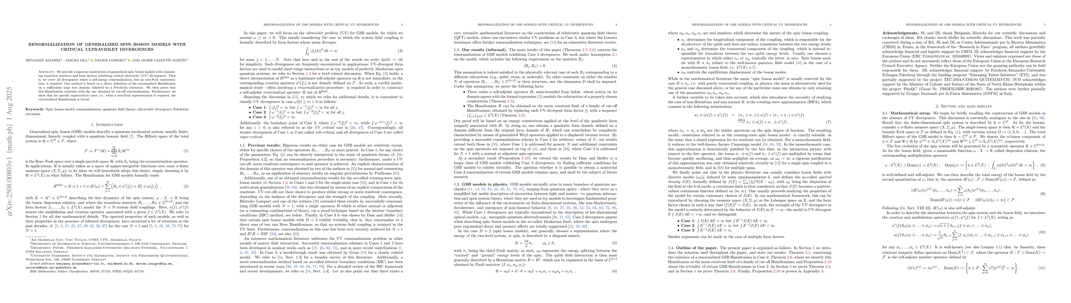We provide a rigorous construction of generalized spin--boson models with commuting transition matrices and form factors exhibiting critical ultraviolet (UV) divergences. That is, we cover all divergences where a self-energy renormalization, but no non-Fock representation, is required. Our method is based on a direct definition of the renormalized Hamiltonian on a sufficiently large test domain, followed by a Friedrichs extension. We then prove that this Hamiltonian coincides with the one obtained by cut-off renormalization. Furthermore, we show that for specific supercritical cases, i.e., when a non-Fock representation is required, the renormalized Hamiltonian is trivial.