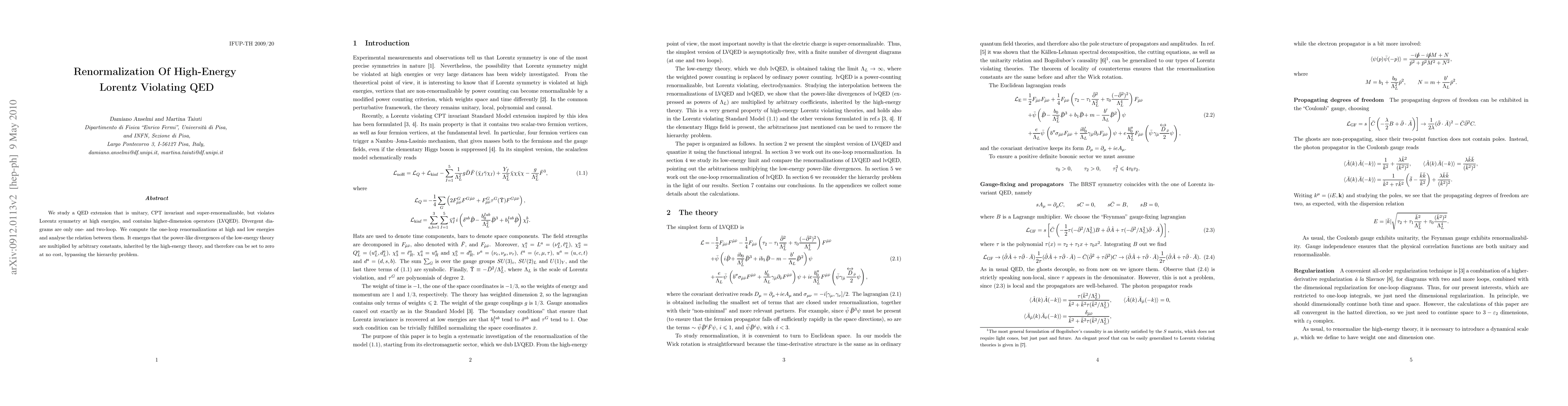 This paper investigates a high-energy extension of QED (LVQED) that maintains unitarity, CPT invariance, and super-renormalizability while violating Lorentz symmetry. The study finds that the renormalization process at high and low energies allows for the elimination of power-like divergences at no additional cost, effectively resolving the hierarchy problem.
