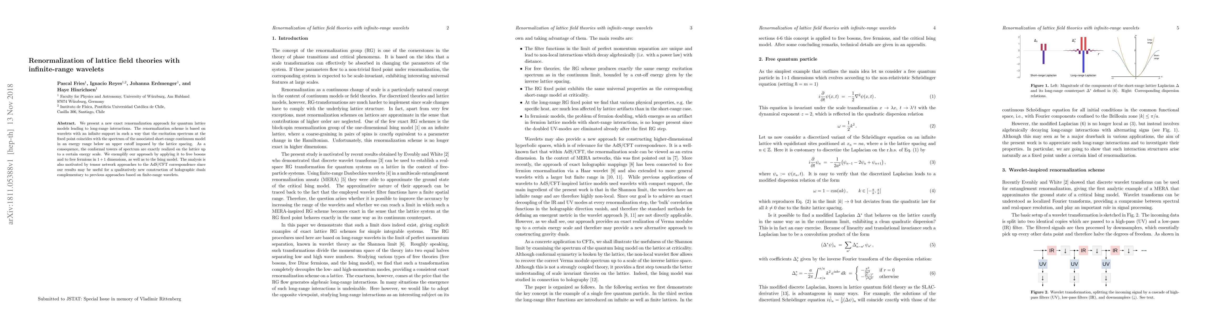 We present a new exact renormalization approach for quantum lattice models leading to long-range interactions. The renormalization scheme is based on wavelets with an infinite support in such a way that the excitation spectrum at the fixed point coincides with the spectrum of the associated short-range continuum model in an energy range below an upper cutoff imposed by the lattice spacing. As a consequence, the conformal towers of spectrum are exactly realized on the lattice up to a certain energy scale. We exemplify our approach by applying it to free bosons and to free fermions in $1+1$ dimensions, as well as to the Ising model. The analysis is also motivated by tensor network approaches to the AdS/CFT correspondence since our results may be useful for a qualitatively new construction of holographic duals complementary to previous approaches based on finite-range wavelets.