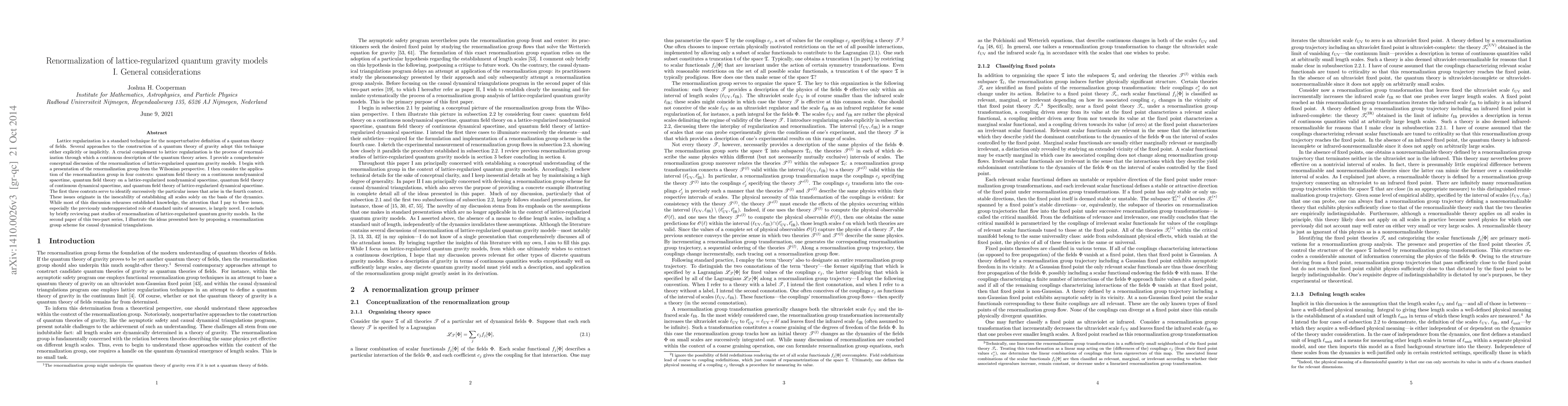 Lattice regularization is a standard technique for the nonperturbative definition of a quantum theory of fields. Several approaches to the construction of a quantum theory of gravity adopt this technique either explicitly or implicitly. A crucial complement to lattice regularization is the process of renormalization through which a continuous description of the quantum theory arises. I provide a comprehensive conceptual discussion of the renormalization of lattice-regularized quantum gravity models. I begin with a presentation of the renormalization group from the Wilsonian perspective. I then consider the application of the renormalization group in four contexts: quantum field theory on a continuous nondynamical spacetime, quantum field theory on a lattice-regularized nondynamical spacetime, quantum field theory of continuous dynamical spacetime, and quantum field theory of lattice-regularized dynamical spacetime. The first three contexts serve to identify successively the particular issues that arise in the fourth context. These issues originate in the inescability of establishing all scales solely on the basis of the dynamics. While most of this discussion rehearses established knowledge, the attention that I pay to these issues, especially the previously underappreciated role of standard units of measure, is largely novel. I conclude by briefly reviewing past studies of renormalization of lattice-regularized quantum gravity models. In the second paper of this two-part series, I illustrate the ideas presented here by proposing a renormalization group scheme for causal dynamical triangulations.