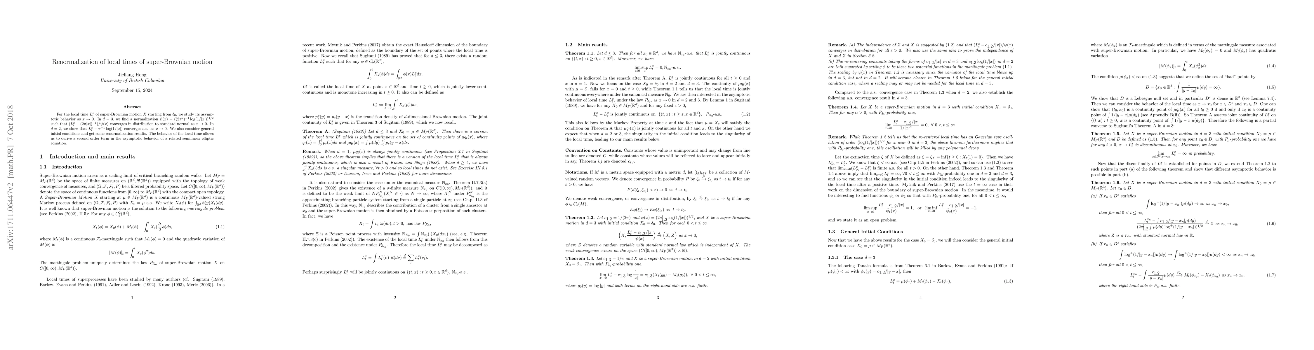 This paper investigates the renormalization of local times in super-Brownian motion, revealing that in three dimensions, a specific normalization leads to convergence to a standard normal distribution, while in two dimensions, the local time converges almost surely, providing insights into the behavior of related semilinear elliptic equations.