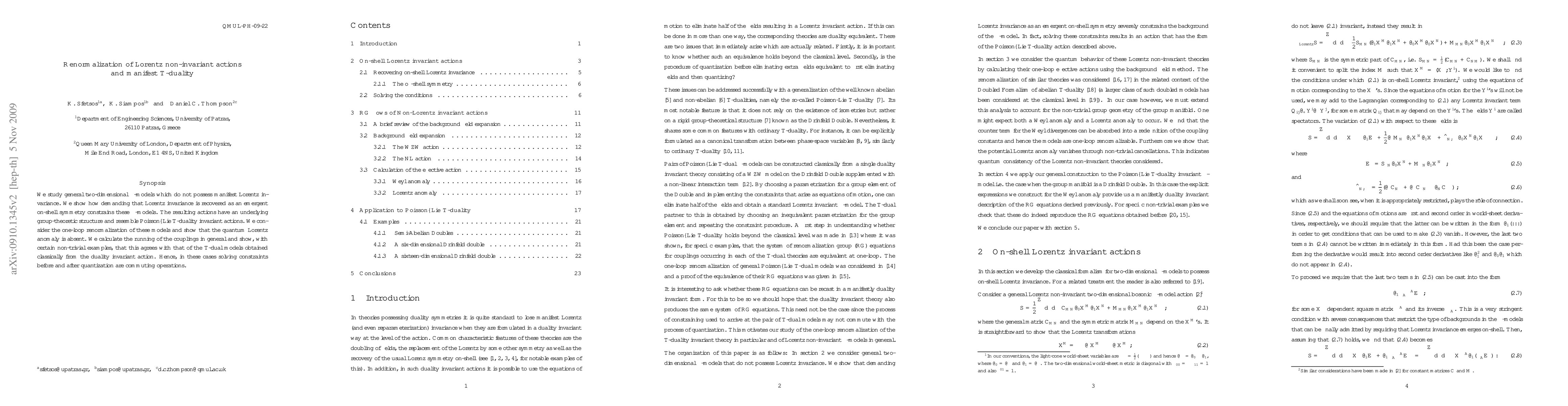 This paper investigates two-dimensional sigma-models lacking manifest Lorentz invariance, demonstrating that emergent on-shell Lorentz symmetry constrains these models, leading to a group-theoretic structure akin to Poisson-Lie T-duality. It shows that one-loop renormalization preserves the absence of quantum Lorentz anomalies and aligns the running of couplings with those of their T-dual counterparts.
