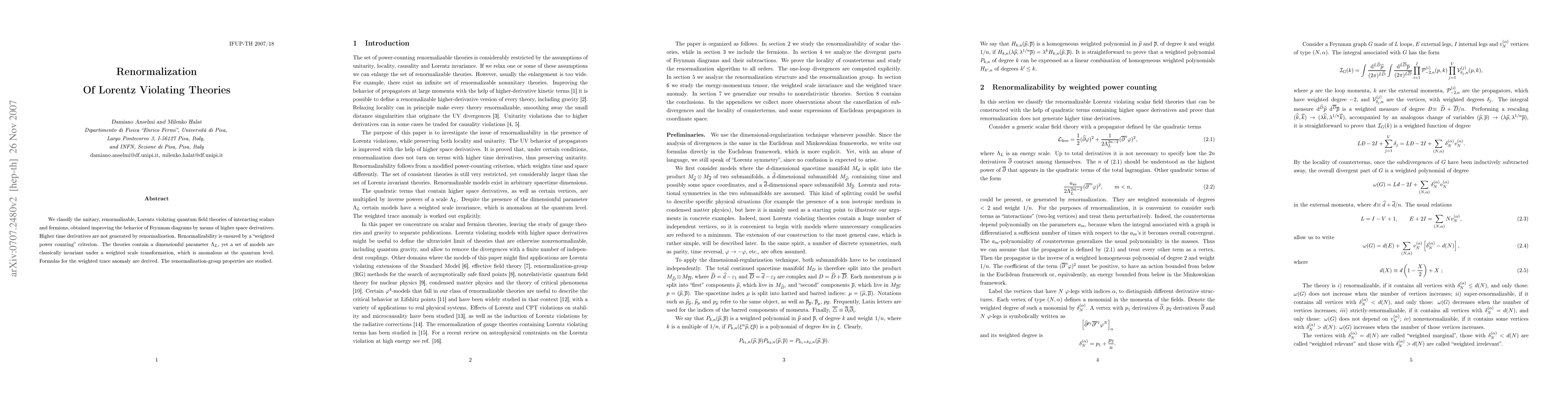 We classify the unitary, renormalizable, Lorentz violating quantum field theories of interacting scalars and fermions, obtained improving the behavior of Feynman diagrams by means of higher space derivatives. Higher time derivatives are not generated by renormalization. Renormalizability is ensured by a "weighted power counting" criterion. The theories contain a dimensionful parameter, yet a set of models are classically invariant under a weighted scale transformation, which is anomalous at the quantum level. Formulas for the weighted trace anomaly are derived. The renormalization-group properties are studied.