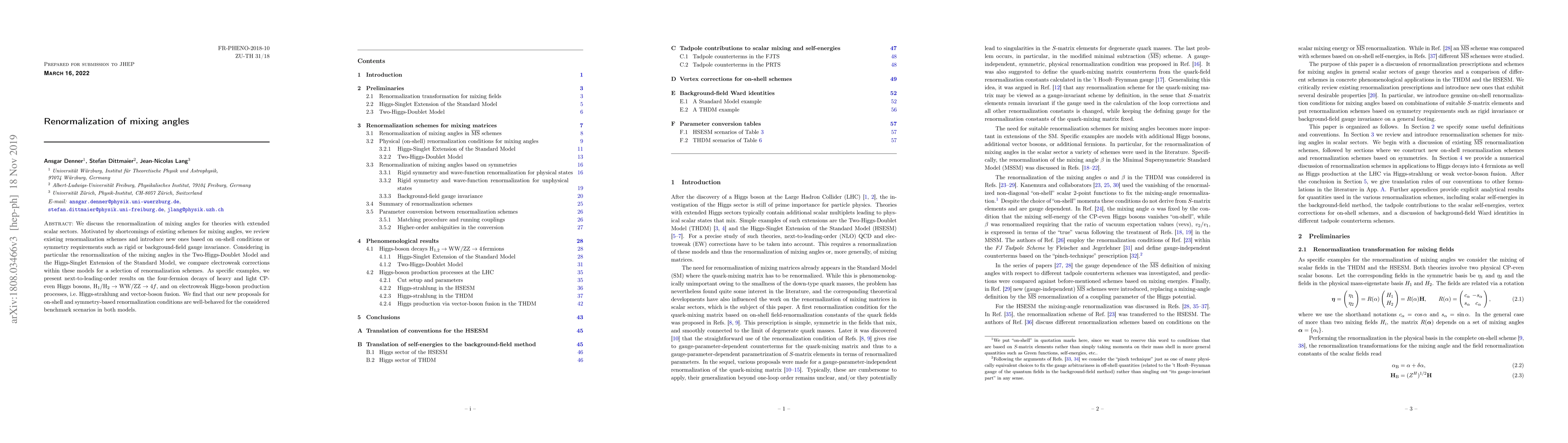 This paper investigates the renormalization of mixing angles in extended scalar sector theories, particularly focusing on the Two-Higgs-Doublet Model and the Higgs-Singlet Extension of the Standard Model. It proposes new renormalization schemes based on on-shell conditions and symmetry requirements, finding these methods provide stable electroweak corrections in selected processes.