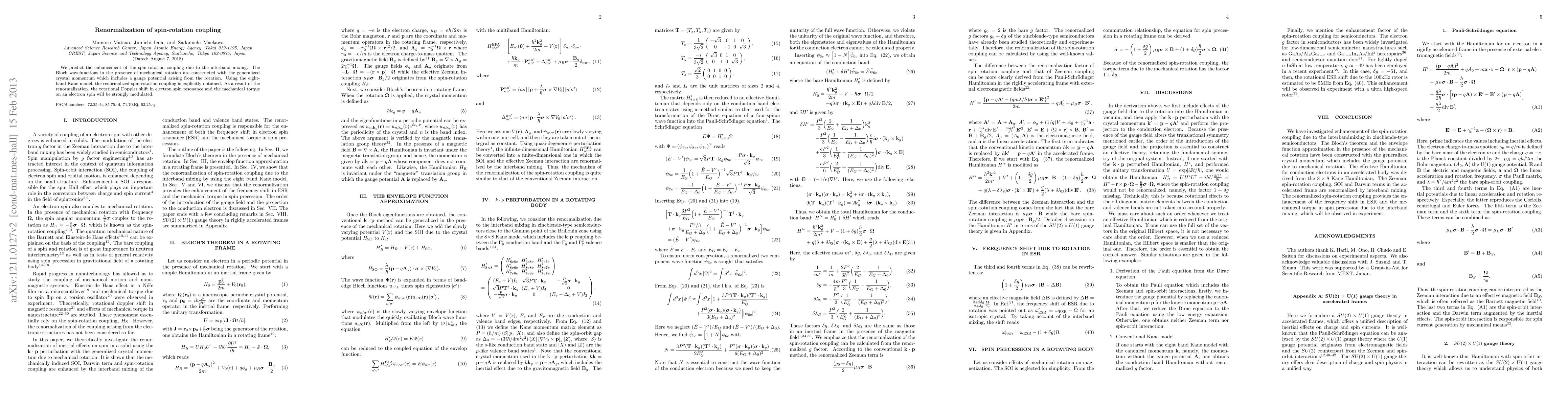 We predict the enhancement of the spin-rotation coupling due to the interband mixing. The Bloch wavefunctions in the presence of mechanical rotation are constructed with the generalized crystal momentum which includes a gauge potential arising from the rotation. Using the eight- band Kane model, the renormalized spin-rotation coupling is explicitly obtained. As a result of the renormalization, the rotational Doppler shift in electron spin resonance and the mechanical torque on an electron spin will be strongly modulated.
