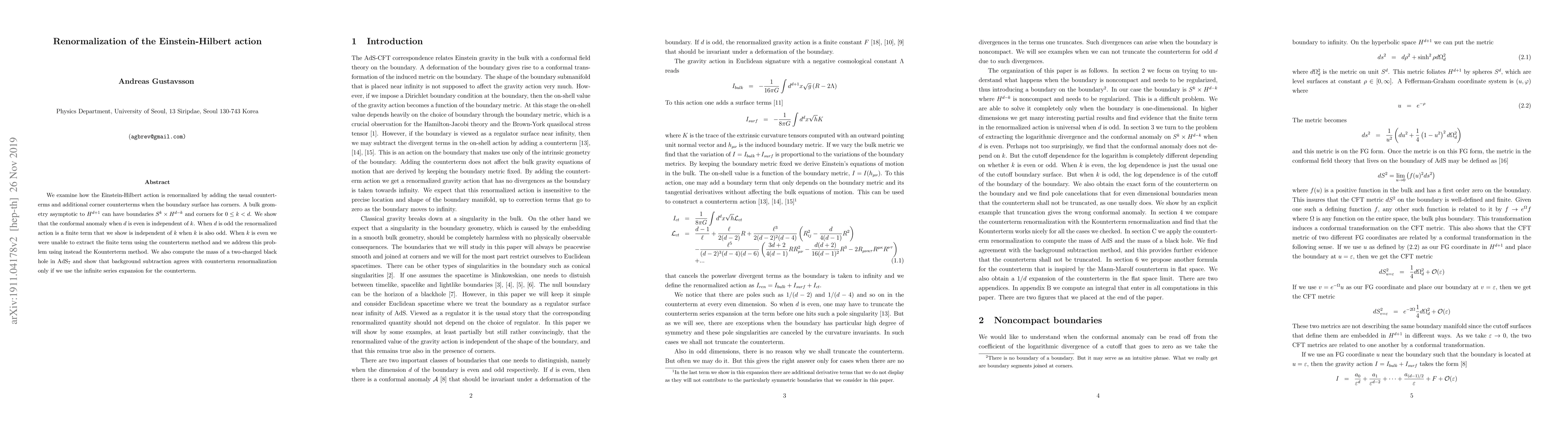 Researchers studied how the Einstein-Hilbert action is renormalized in manifolds with corners, finding that conformal anomaly depends on d parity and k parity, with some exceptions for odd d and even k.