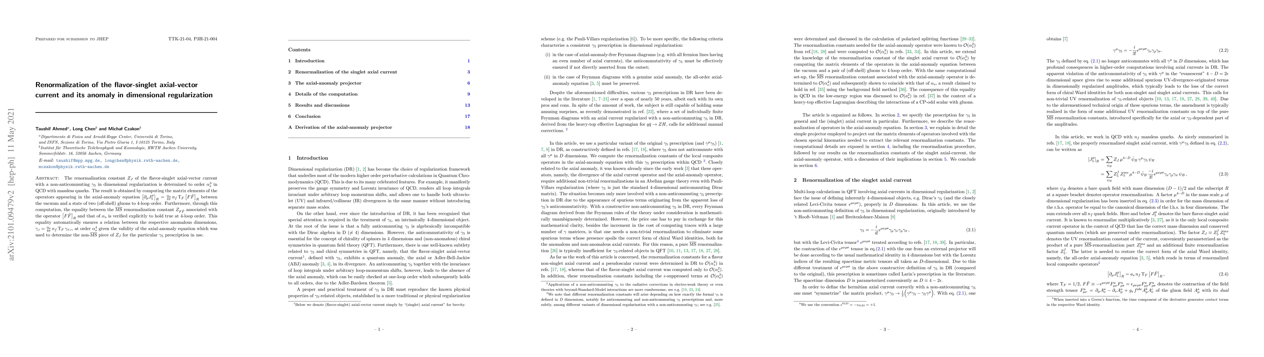 This paper determines the renormalization constant $Z_J$ for the flavor-singlet axial-vector current in dimensional regularization to order $\alpha_s^3$ in QCD, verifying the equality between the $\overline{\mathrm{MS}}$ renormalization constant $Z_{F\tilde{F}}$ and $\alpha_s$ to 4-loop order, which ensures a relation between their anomalous dimensions at order $\alpha_s^4$.