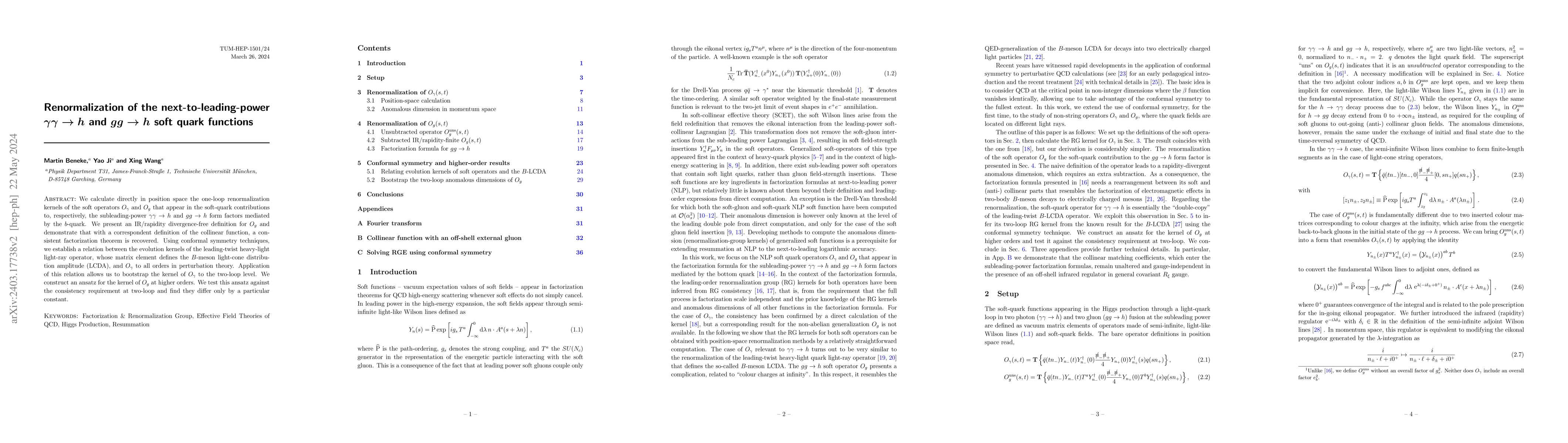 We calculate directly in position space the one-loop renormalization kernels of the soft operators $O_\gamma$ and $O_g$ that appear in the soft-quark contributions to, respectively, the subleading-power $\gamma\gamma\to h$ and $gg\to h$ form factors mediated by the $b$-quark. We present an IR/rapidity divergence-free definition for $O_g$ and demonstrate that with a correspondent definition of the collinear function, a consistent factorization theorem is recovered. Using conformal symmetry techniques, we establish a relation between the evolution kernels of the leading-twist heavy-light light-ray operator, whose matrix element defines the $B$-meson light-cone distribution amplitude (LCDA), and $O_\gamma$ to all orders in perturbation theory. Application of this relation allows us to bootstrap the kernel of $O_\gamma$ to the two-loop level. We construct an ansatz for the kernel of $O_g$ at higher orders. We test this ansatz against the consistency requirement at two-loop and find they differ only by a particular constant.