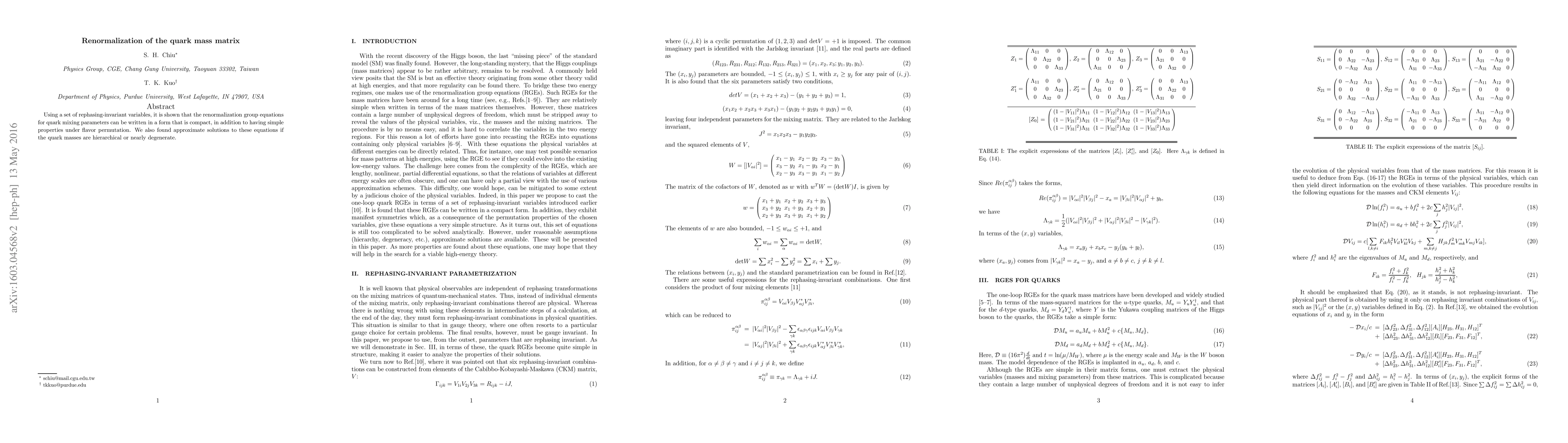 Using a set of rephasing-invariant variables, it is shown that the renormalization group equations for quark mixing parameters can be written in a form that is compact, in addition to having simple properties under flavor permutation. We also found approximate solutions to these equations if the quark masses are hierarchical or nearly degenerate.