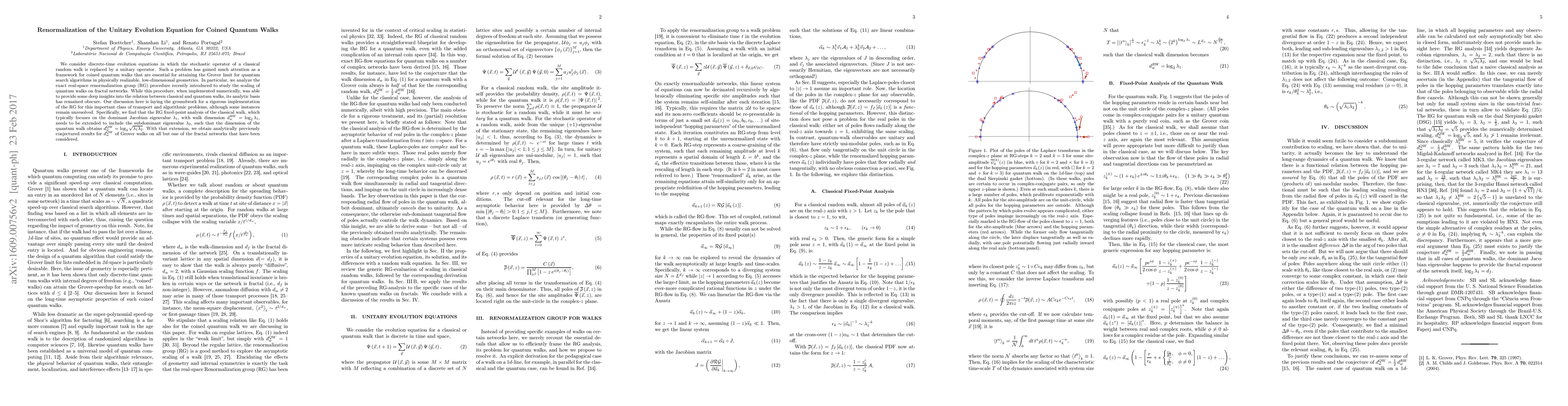 We consider discrete-time evolution equations in which the stochastic operator of a classical random walk is replaced by a unitary operator. Such a problem has gained much attention as a framework for coined quantum walks that are essential for attaining the Grover limit for quantum search algorithms in physically realizable, low-dimensional geometries. In particular, we analyze the exact real-space renormalization group (RG) procedure recently introduced to study the scaling of quantum walks on fractal networks. While this procedure, when implemented numerically, was able to provide some deep insights into the relation between classical and quantum walks, its analytic basis has remained obscure. Our discussion here is laying the groundwork for a rigorous implementation of the RG for this important class of transport and algorithmic problems, although some instances remain unresolved. Specifically, we find that the RG fixed-point analysis of the classical walk, which typically focuses on the dominant Jacobian eigenvalue $\lambda_{1}$, with walk dimension $d_{w}^{RW}=\log_{2}\lambda_{1}$, needs to be extended to include the subdominant eigenvalue $\lambda_{2}$, such that the dimension of the quantum walk obtains $d_{w}^{QW}=\log_{2}\sqrt{\lambda_{1}\lambda_{2}}$. With that extension, we obtain analytically previously conjectured results for $d_{w}^{QW}$ of Grover walks on all but one of the fractal networks that have been considered.
