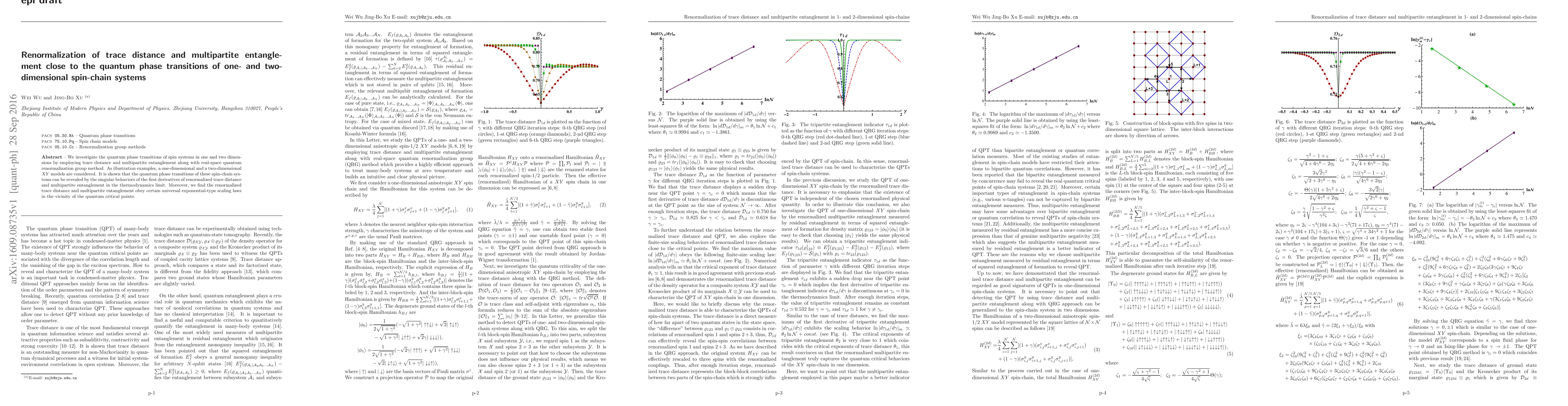 This paper examines quantum phase transitions in one- and two-dimensional spin-chain systems using trace distance and multipartite entanglement, revealing singular behaviors near critical points. It finds universal exponential-type scaling laws for renormalized trace distance and multipartite entanglement in the thermodynamic limit.