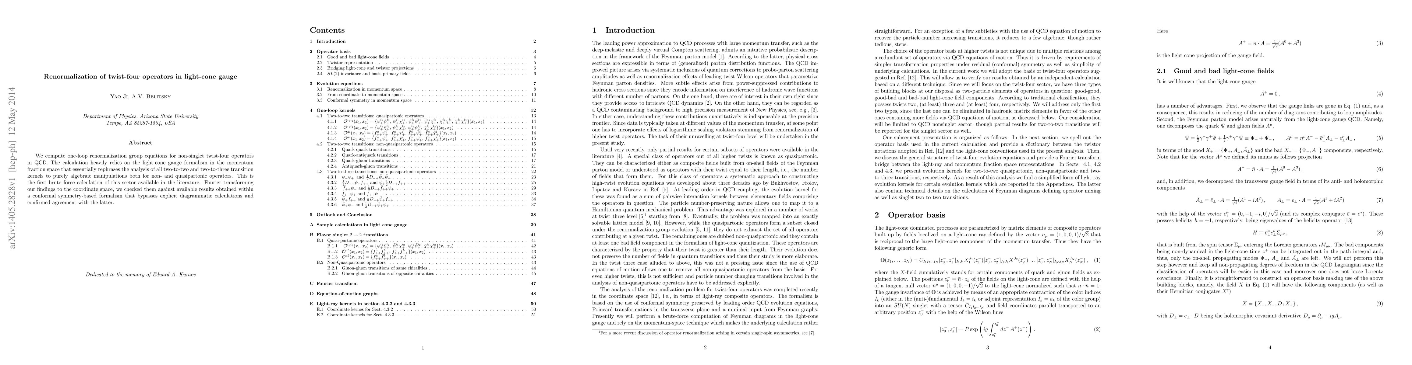 This paper computes one-loop renormalization group equations for twist-four operators in QCD using the light-cone gauge formalism, transforming complex transition kernels into algebraic manipulations. The results are verified against existing conformal symmetry-based methods, confirming their accuracy.