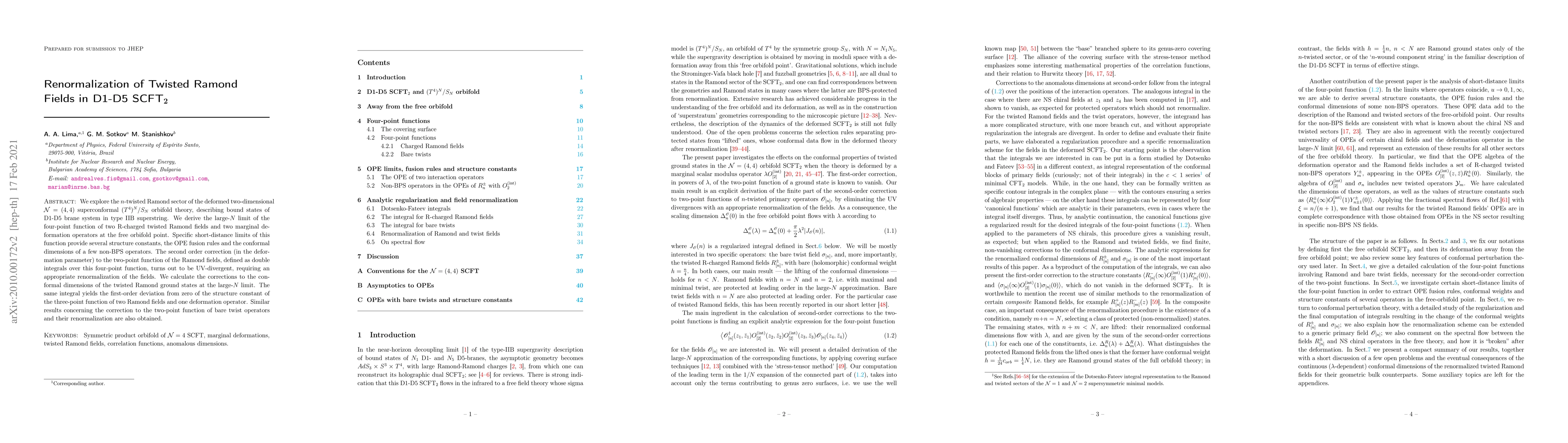 We explore the Ramond sector of the deformed two-dimensional $\cal N = (4, 4)$ superconformal $(T^4)^N /S_N$ orbifold theory, describing bound states of D1-D5 brane system in type IIB superstring. We derive the large-$N$ limit of the four-point function of two R-charged twisted Ramond fields and two marginal deformation operators at the free orbifold point. Specific short-distance limits of this function provide several structure constants, the OPE fusion rules and the conformal dimensions of a few non-BPS operators. The second order correction (in the deformation parameter) to the two-point function of the Ramond fields, defined as double integrals over this four-point function, turns out to be UV-divergent, requiring an appropriate renormalization of the fields. We calculate the corrections to the conformal dimensions of the twisted Ramond ground states at the large-$N$ limit. The same integral yields the first-order deviation from zero of the structure constant of the three-point function of two Ramond fields and one deformation operator. Similar results concerning the correction to the two-point function of bare twist operators and their renormalization are also obtained.