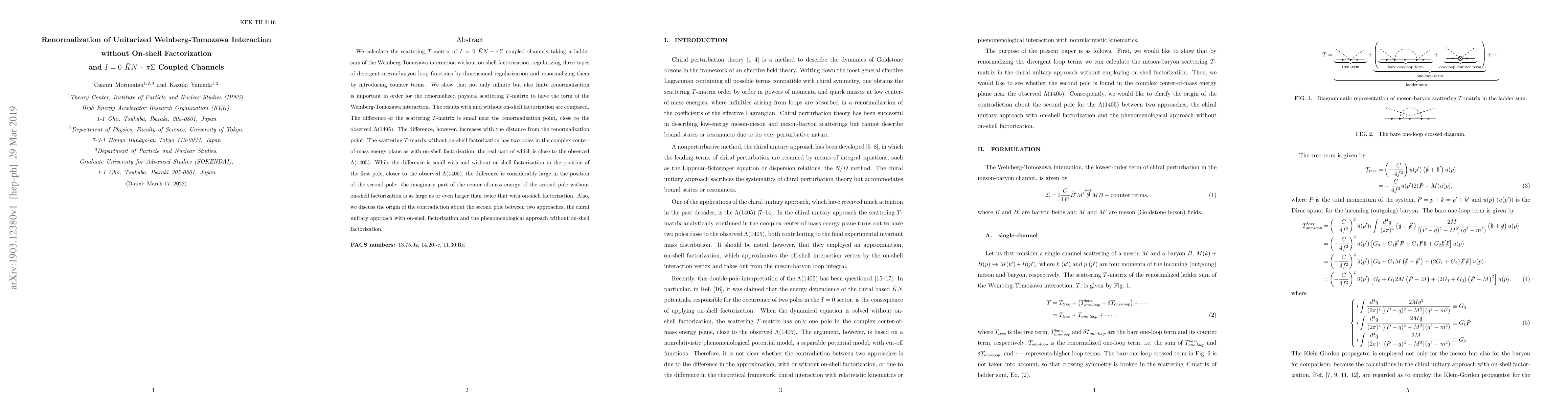We calculate the scattering $T$-matrix of $I=0$ $\bar K N-\pi \Sigma$ coupled channels taking a ladder sum of the Weinberg-Tomozawa interaction without on-shell factorization, regularizing three types of divergent meson-baryon loop functions by dimensional regularization and renormalizing them by introducing counter terms. We show that not only infinite but also finite renormalization is important in order for the renormalized physical scattering $T$-matrix to have the form of the Weinberg-Tomozawa interaction. The results with and without on-shell factorization are compared. The difference of the scattering $T$-matrix is small near the renormalization point, close to the observed $\Lambda$(1405). The difference, however, increases with the distance from the renormalization point. The scattering $T$-matrix without on-shell factorization has two poles in the complex center-of-mass energy plane as with on-shell factorization, the real part of which is close to the observed $\Lambda$(1405). While the difference is small with and without on-shell factorization in the position of the first pole, closer to the observed $\Lambda$(1405), the difference is considerably large in the position of the second pole: the imaginary part of the center-of-mass energy of the second pole without on-shell factorization is as large as or even larger than twice that with on-shell factorization. Also, we discuss the origin of the contradiction about the second pole between two approaches, the chiral unitary approach with on-shell factorization and the phenomenological approach without on-shell factorization.