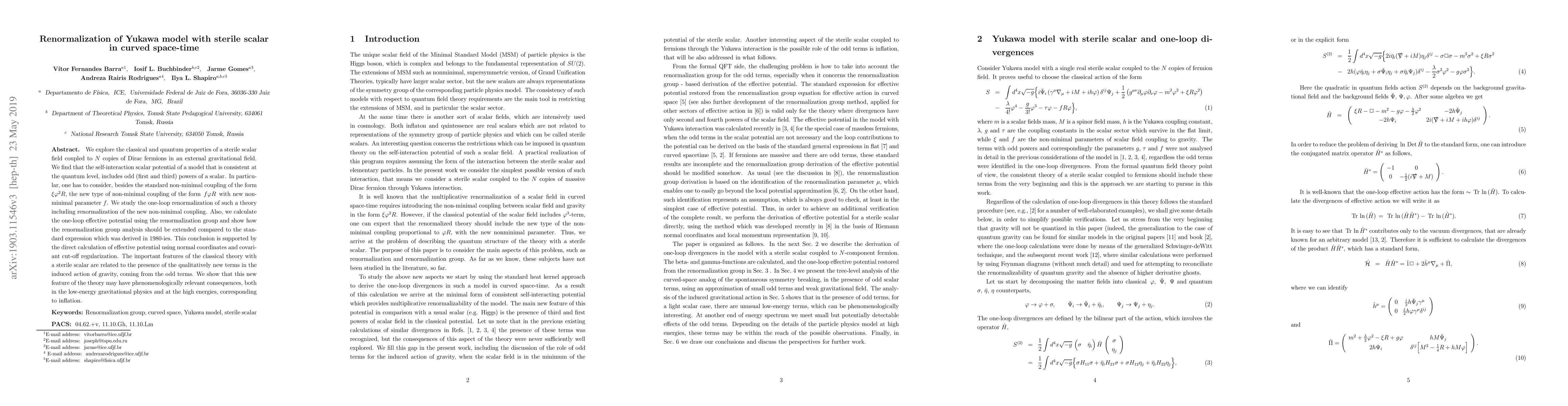We explore the classical and quantum properties of a sterile scalar field coupled to $N$ copies of Dirac fermions in an external gravitational field. We find that the self-interaction scalar potential of a model that is consistent at the quantum level, includes odd (first and third) powers of a scalar. In particular, one has to consider, besides the standard non-minimal coupling of the form $\xi \varphi^2 R$, the new type of non-minimal coupling of the form $f\varphi R$ with new non-minimal parameter $f$. We study the one-loop renormalization of such a theory including renormalization of the new non-minimal coupling. Also, we calculate the one-loop effective potential using the renormalization group and show how the renormalization group analysis should be extended compared to the standard expression which was derived in 1980-ies. This conclusion is supported by the direct calculation of effective potential using normal coordinates and covariant cut-off regularization. The important features of the classical theory with a sterile scalar are related to the presence of the qualitatively new terms in the induced action of gravity, coming from the odd terms. We show that this new feature of the theory may have phenomenologically relevant consequences, both in the low-energy gravitational physics and at the high energies, corresponding to inflation.