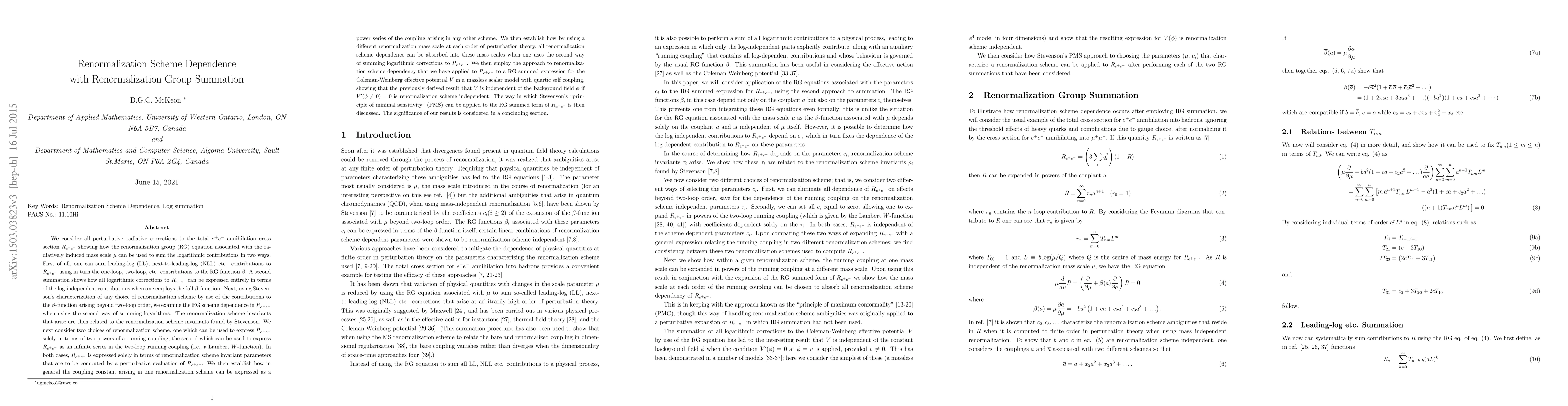 We consider all radiative corrections to the total electron-positron cross section showing how the renormalization group equation can be used to sum the logarithmic contributions in two ways. First of all, one can sum leading-log etc. contributions. A second summation shows how all logarithmic corrections can be expressed in terms of log-independent contributions. Next, using Stevenson's characterization of renormalization scheme, we examine scheme dependence when using the second way of summing logarithms. The renormalization scheme invariants that arise are then related to those of Stevenson. We consider two choices of renormalization scheme, one resulting in two powers of a running coupling, the second in an infinite series in the two loop running constant. We then establish how the coupling constant arising in one renormalization scheme can be expressed as a power series of the coupling in any other scheme. Next we establish how by using different mass scale at each order of perturbation theory, all renormalization scheme dependence can be absorbed into these mass scales when one uses the second way of summing logarithmic corrections. We then employ this approach to renormalization scheme dependency to the effective potential in a scalar model, showing the result that it is independent of the background field is scheme independent. The way in which the "principle of minimal sensitivity" can be applied after summation is then discussed.