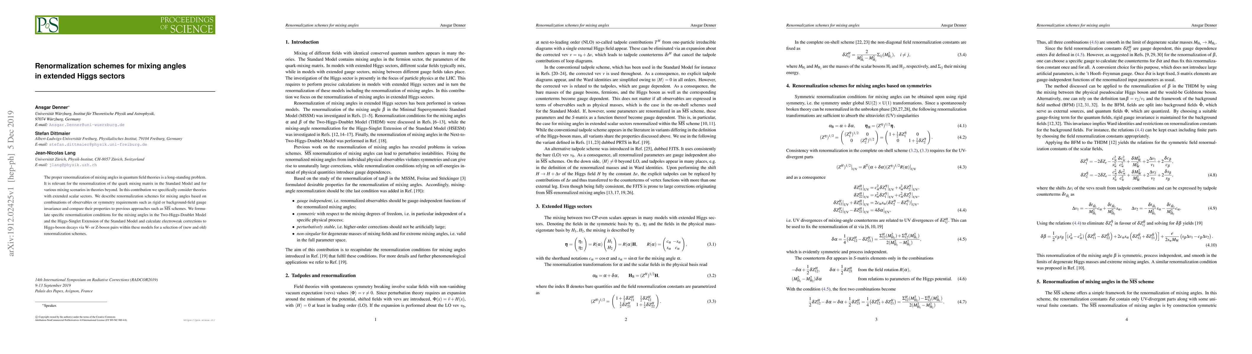 The proper renormalization of mixing angles in quantum field theories is a long-standing problem. It is relevant for the renormalization of the quark mixing matrix in the Standard Model and for various mixing scenarios in theories beyond. In this contribution we specifically consider theories with extended scalar sectors. We describe renormalization schemes for mixing angles based on combinations of observables or symmetry requirements such as rigid or background-field gauge invariance and compare their properties to previous approaches such as $\bar{MS}$ schemes. We formulate specific renormalization conditions for the mixing angles in the Two-Higgs-Doublet Model and the Higgs-Singlet Extension of the Standard Model and calculate electroweak corrections to Higgs-boson decays via W- or Z-boson pairs within these models for a selection of (new and old) renormalization schemes.