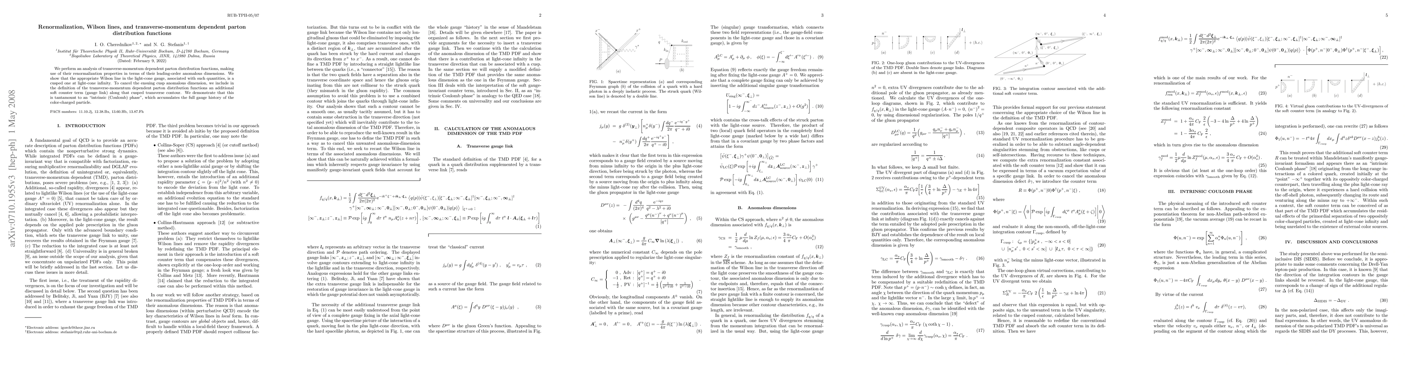 This paper analyzes transverse-momentum dependent parton distribution functions, revealing their renormalization properties through leading-order anomalous dimensions. It introduces a cusped Wilson line in the light-cone gauge and includes a soft counter term (gauge link) to cancel the cusp anomalous dimension, representing an intrinsic Coulomb phase that captures the full gauge history of the particle.