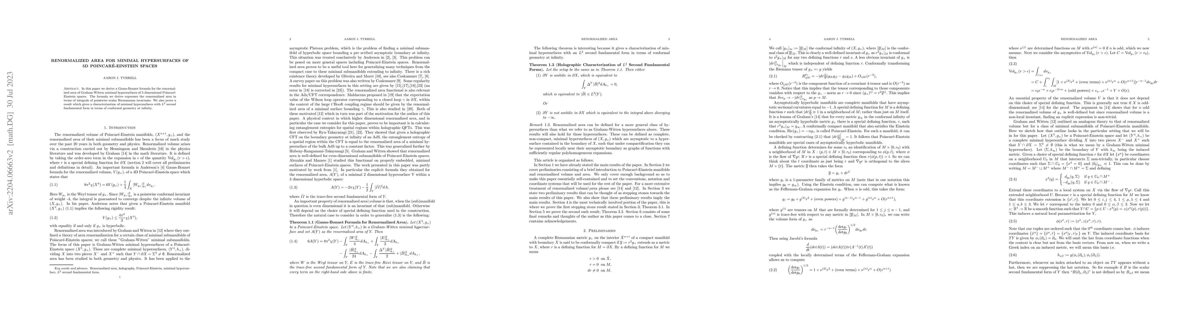 This paper derives a Gauss-Bonnet formula for the renormalized area of Graham-Witten minimal hypersurfaces in 5D Poincaré-Einstein spaces, linking it to integrals of Riemannian invariants. It also characterizes minimal hypersurfaces with $L^2$ second fundamental form via conformal geometry at infinity.