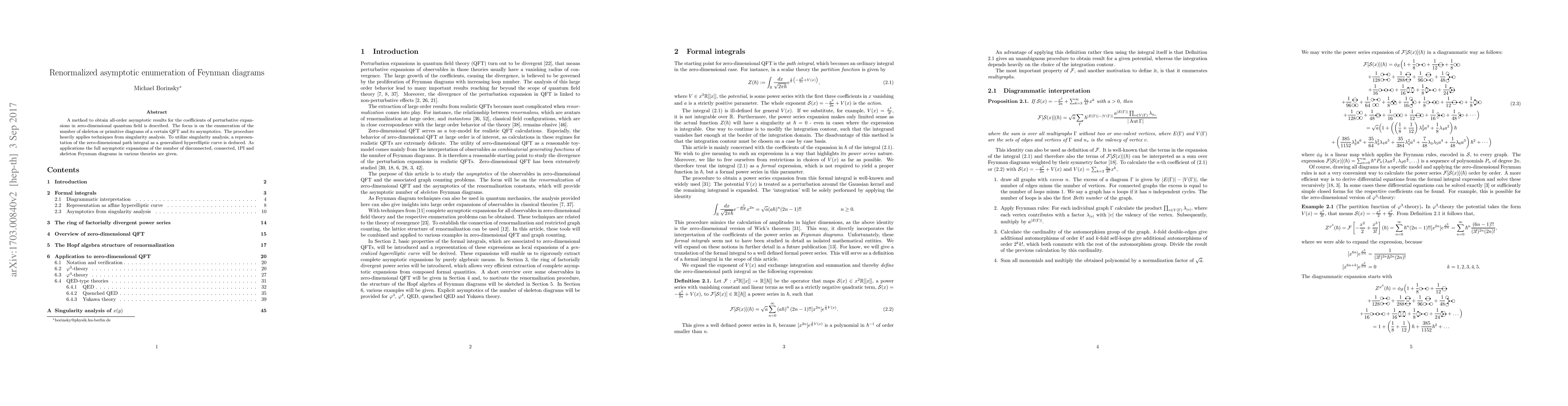 This paper introduces a method for obtaining all-order asymptotic results for coefficients in perturbative expansions of zero-dimensional quantum field theories, emphasizing the enumeration and asymptotics of skeleton Feynman diagrams, utilizing singularity analysis and a representation of the path integral as a generalized hyperelliptic curve. Applications include full asymptotic expansions for various types of Feynman diagrams.